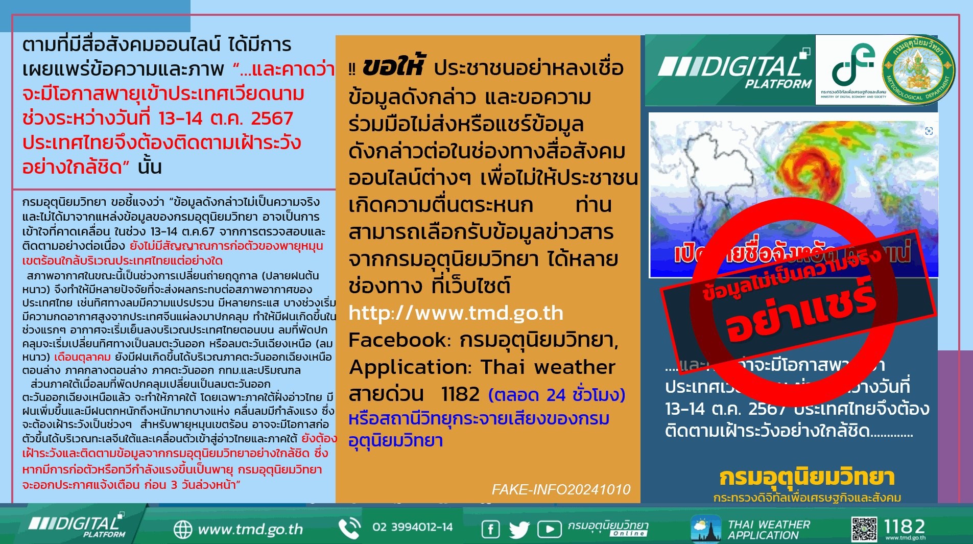 นายจิรายุ ห่วงทรัพย์ โฆษกศูนย์ปฏิบัติการช่วยเหลือผู้ประสบอุทกภัย วาตภัย และดินโคลนถล่ม (ศปช.) ชี้แจงกรณีสื่อสังคมออนไลน์ได้มีข้อมูลว่า จะมีโอกาสพายุเข้าประเทศเวียดนามระหว่างวันที่ 13 – 14 ต.ค.นี้ ประเทศไทยจึงต้องติดตามเฝ้าระวังอย่างใกล้ชิด ว่า ได้ตรวจสอบข้อมูลกับกรมอุตุนิยมวิทยาแล้ว ข้อมูลดังกล่าวไม่เป็นความจริงและไม่ได้มาจากแหล่งข้อมูลของกรมอุตุนิยมวิทยา อาจเป็นการเข้าใจที่คลาดเคลื่อนและจากการตรวจสอบติดตามอย่างต่อเนื่องยังไม่มีสัญญาณการก่อตัวของพายุหมุนเขตร้อนใกล้บริเวณประเทศไทยแต่อย่างใด