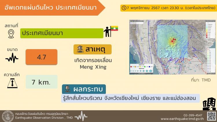 ศูนย์ปฎิบัติการธรณีพิบัติภัย กรมทรัพยากรธรณี รายงานว่า เมื่อเวลา 23.30 น. วานนี้ (7 พ.ย.) เกิดแผ่นดินไหวขนาด 4.7 ที่ระดับความลึก 7 กม. บริเวณประเทศเมียนมา โดยมีสาเหตุการเกิดจากการเลื่อนตัวของกลุ่มรอยเลื่อนเมงซิง (Mengxing) ตามแนวระนาบเหลื่อมซ้าย (Left lateral strike slip fault)