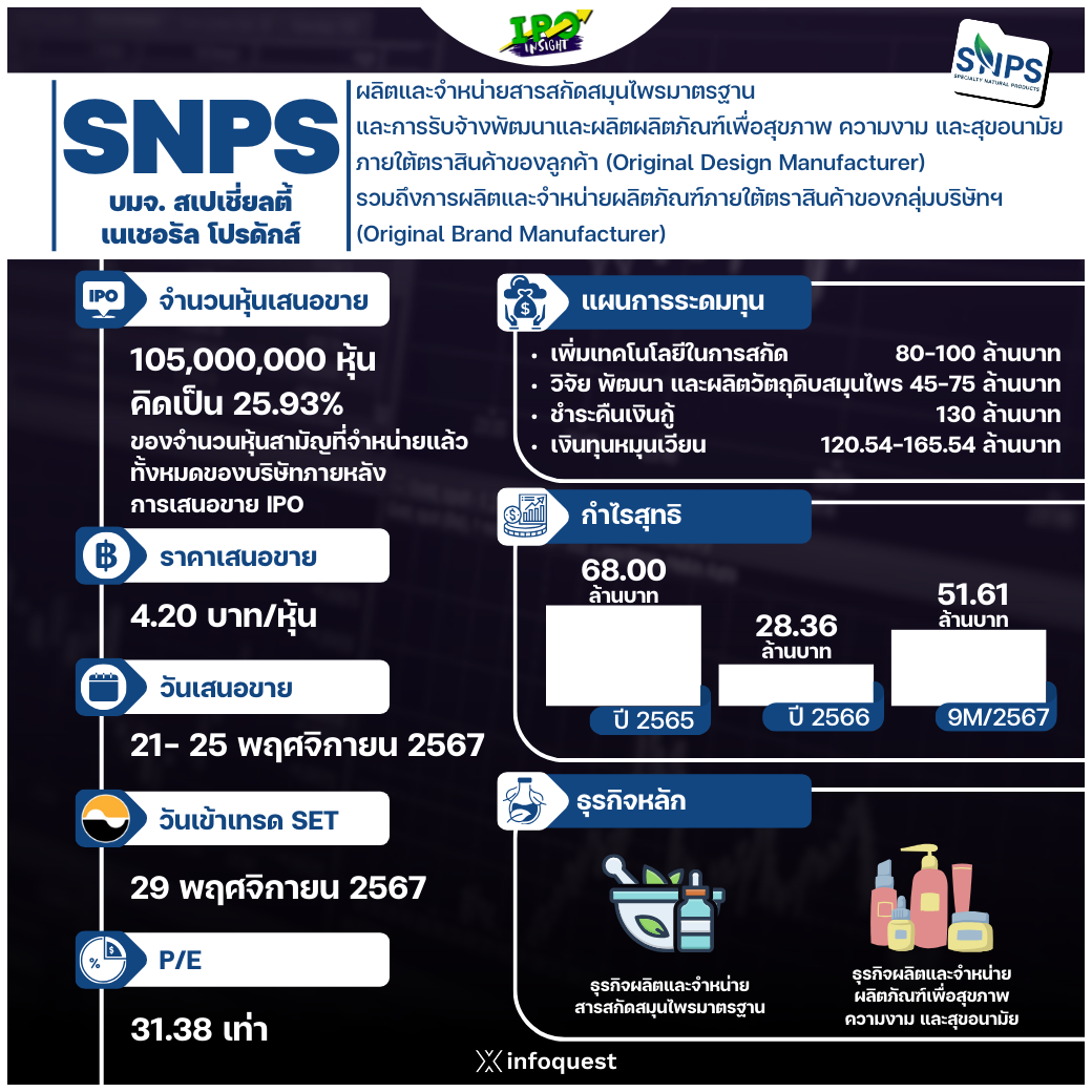 บมจ.สเปเชี่ยลตี้ เนเชอรัล โปรดักส์ (SNPS) หุ้นที่สกัดสมุนไพรไทยด้วยใจรักกว่า 25 ปี !! ขายหุ้น IPO จำนวน 105 ล้านหุ้น ราคาหุ้นละ 4.20 บาท เปิดจองวันที่ 21-22 และ 25 พฤศจิกายน 2567 ใช้อัพเกรดสารสกัดสมุนไพรให้พรีเมียมมากยิ่งขึ้น รวมถึงต่อยอดงานวิจัยสุดล้ำ ขยายสินค้าไปอีกหลายตลาด พร้อมเดินหน้าเข้าจดทะเบียนในตลาดหลักทรัพย์แห่งประเทศไทย (SET) ในวันที่ 29 พฤศจิกายน 2567