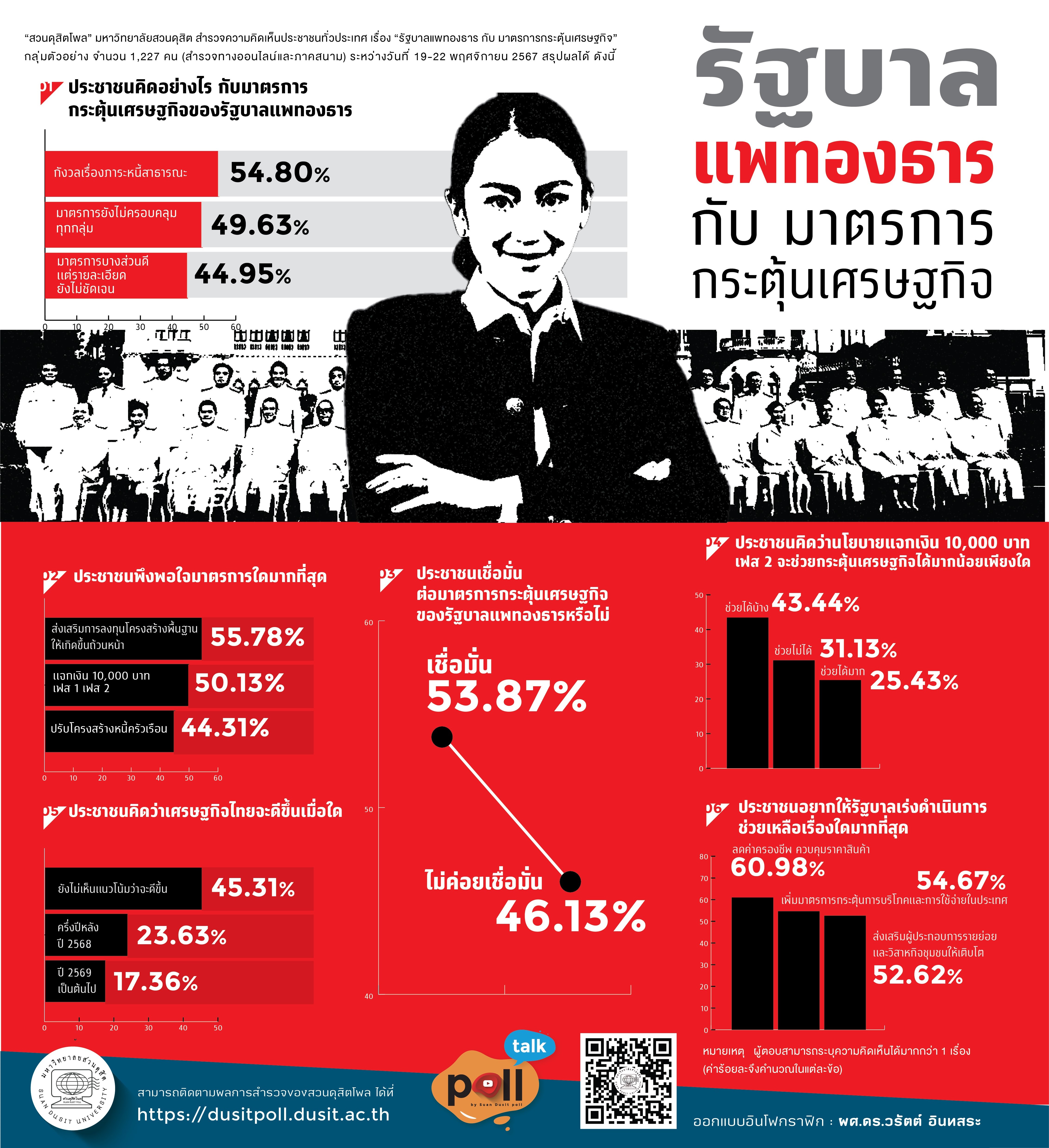 สวนดุสิตโพล มหาวิทยาลัยสวนดุสิต สำรวจความคิดเห็นประชาชนทั่วประเทศ เรื่อง “รัฐบาลแพทองธาร กับมาตรการกระตุ้นเศรษฐกิจ” ระหว่างวันที่ 19-22 พฤศจิกายน 2567 กลุ่มตัวอย่างจำนวน 1,227 คน สำรวจทางออนไลน์และภาคสนาม พบว่า กลุ่มตัวอย่างกังวลว่ามาตรการกระตุ้นเศรษฐกิจของรัฐบาลแพทองธารอาจก่อให้เกิดภาระหนี้สาธารณะ 54.80% ซึ่งจากมาตรการต่าง ๆ ก็พึงพอใจมาตรการส่งเสริมการลงทุนโครงสร้างพื้นฐานให้เกิดขึ้นถ้วนหน้ามากที่สุด 55.78% และเชื่อมั่นต่อมาตรการกระตุ้นเศรษฐกิจของรัฐบาล 53.87% โดยคิดว่านโยบายแจกเงิน 10,000 บาทเฟส 2 อาจจะช่วยกระตุ้นเศรษฐกิจได้บ้าง 43.44% แต่ยังไม่เห็นแนวโน้มว่าเศรษฐกิจไทยจะดีขึ้น 45.31%