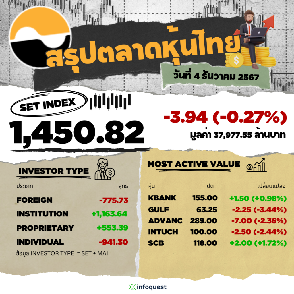 SET ปิดวันนี้ที่ 1,450.82 จุด ลดลง 3.94 จุด (-0.27%) มูลค่าการซื้อขาย 37,977.55 ล้านบาท