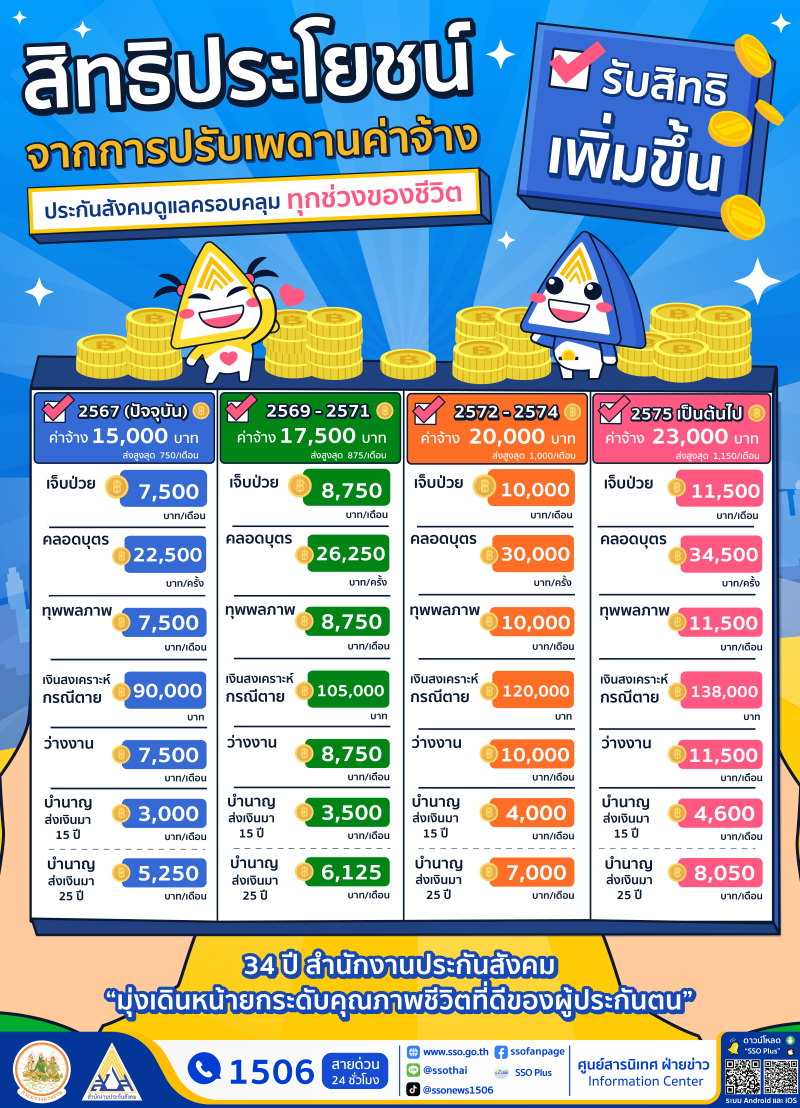 ปี 2569-2571: เพดานค่าจ้าง 17,500 บาท (เงินสมทบสูงสุด 875 บาท/เดือน)