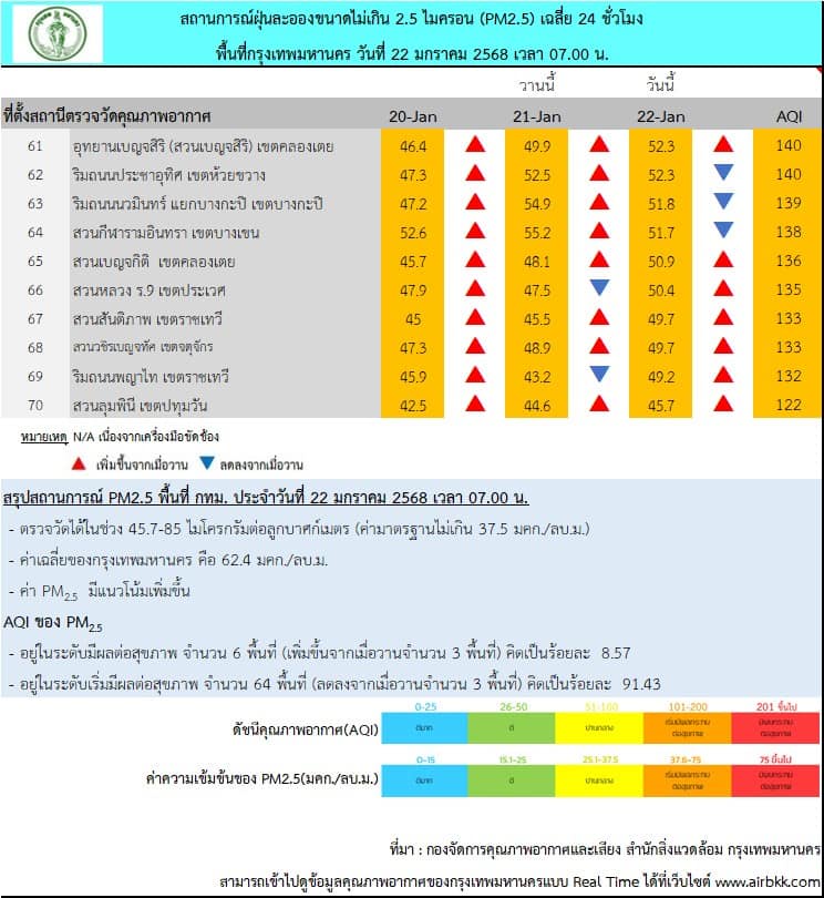 ศูนย์ข้อมูลคุณภาพอากาศกรุงเทพมหานคร (กทม.) รายงานสถานการณ์ฝุ่นละอองขนาดไม่เกิน 2.5 ไมครอน (PM 2.5) เวลา 07.00 น. ค่าเฉลี่ย 24 ชั่วโมง ตรวจวัดได้ 45.7-85 ไมโครกรัม/ลูกบาศก์เมตร (มคก./ลบ.ม.) พบว่า
