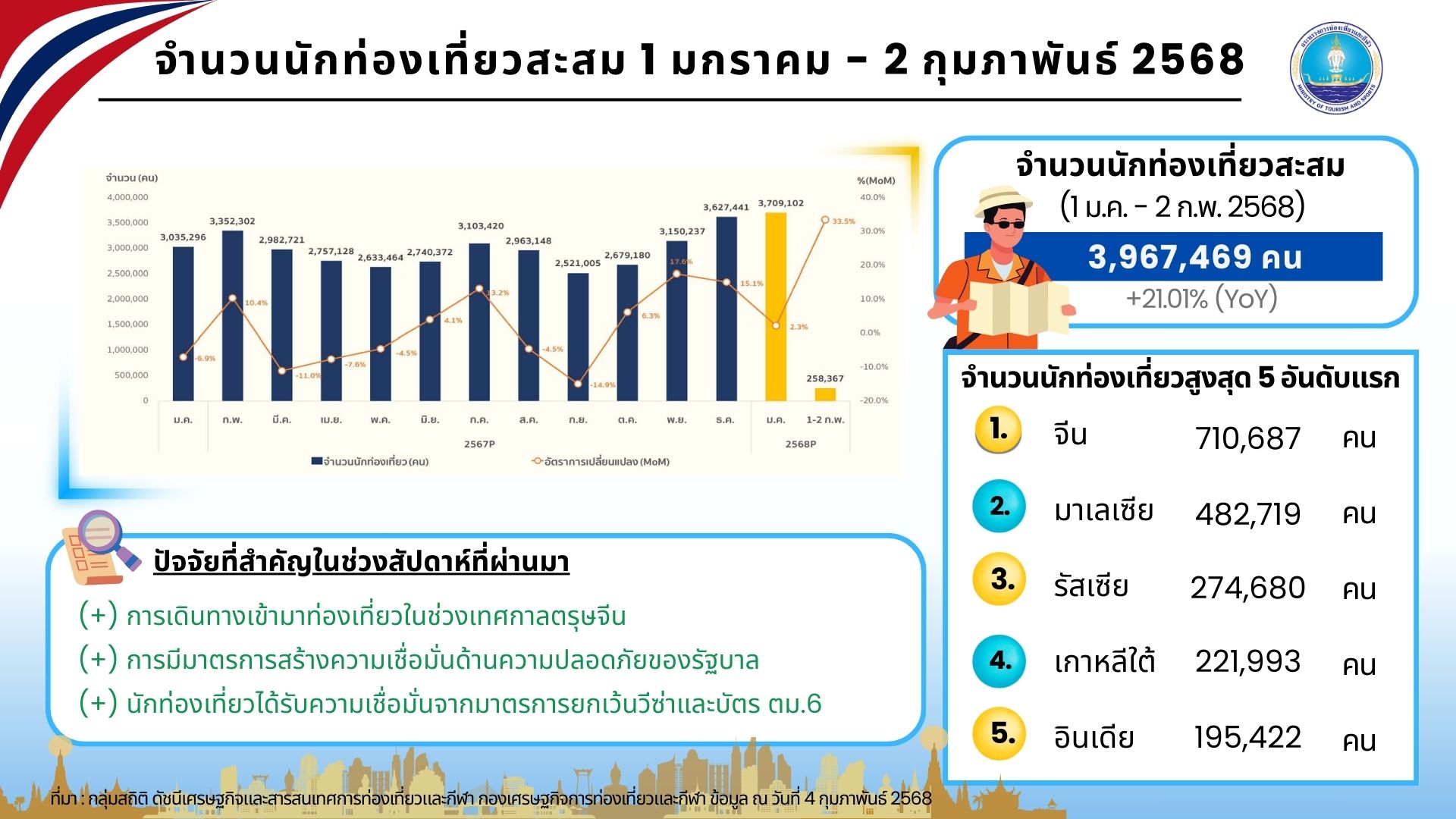 นายสรวงศ์ เทียนทอง รมว.ท่องเที่ยวและกีฬา เปิดเผยภาพรวมการท่องเที่ยวของประเทศไทย ว่า ตั้งแต่วันที่ 1 ม.ค.-2 ก.พ. 68 มีจำนวนนักท่องเที่ยวชาวต่างชาติสะสมทั้งสิ้น 3,967,469 คน สร้างรายได้จากการใช้จ่ายของนักท่องเที่ยวต่างชาติแล้วประมาณ 195,090 ล้านบาท โดยจำนวนนักท่องเที่ยวสูงสุด 5 อันดับแรก ได้แก่ จีน 710,687 คน มาเลเซีย 482,719 คน รัสเซีย 274,680 คน เกาหลีใต้ 221,993 คน และอินเดีย 195,422 คน