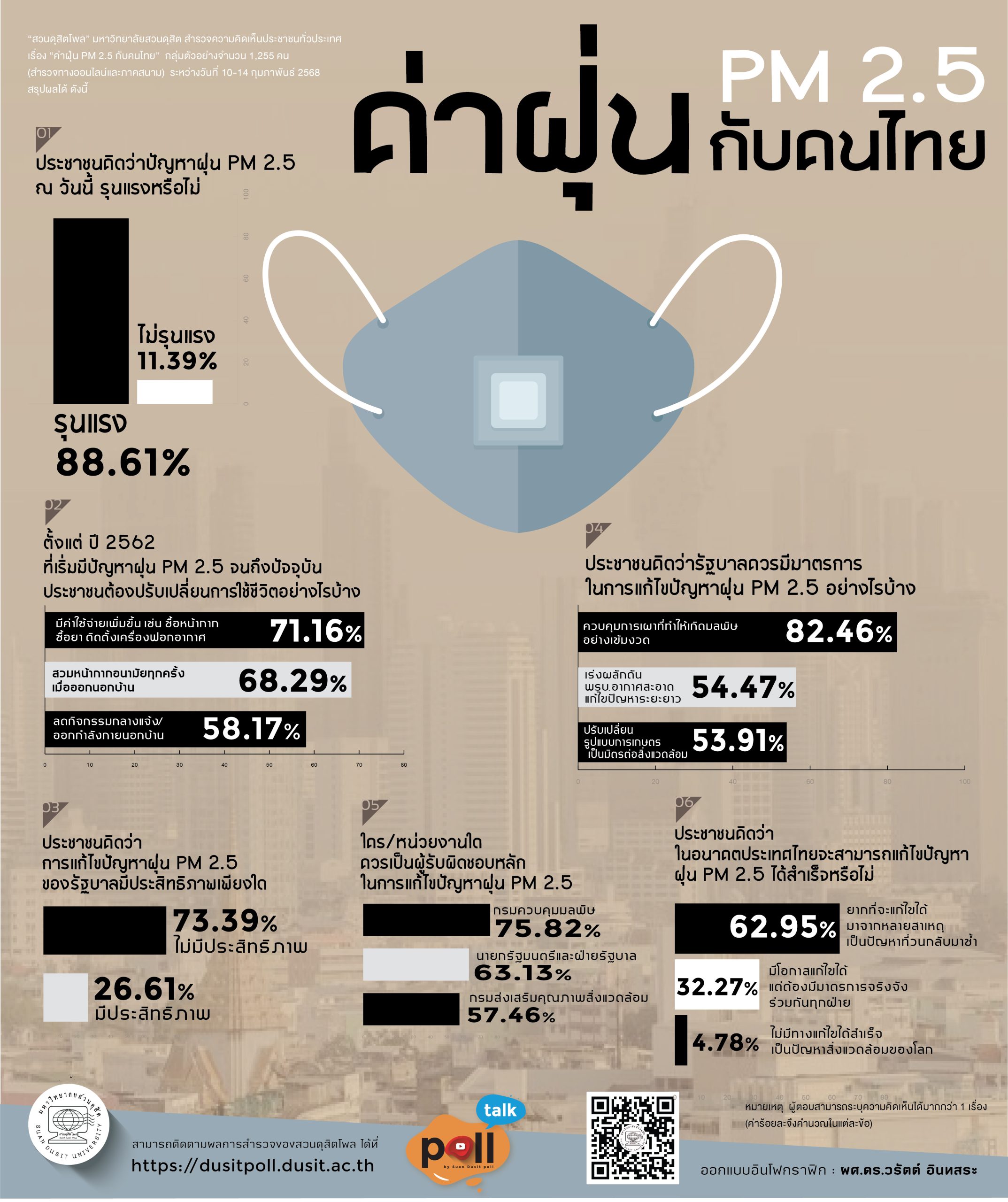 “สวนดุสิตโพล” มหาวิทยาลัยสวนดุสิต สำรวจความคิดเห็นประชาชนทั่วประเทศ เรื่อง “ค่าฝุ่น PM 2.5 กับคนไทย”กลุ่มตัวอย่าง จำนวน 1,255 คน (สำรวจทางออนไลน์และภาคสนาม) ระหว่างวันที่ 10-14 กุมภาพันธ์ 2568 พบว่า กลุ่มตัวอย่างคิดว่าปัญหาฝุ่น PM 2.5 ณ วันนี้ เป็นปัญหาที่รุนแรง ร้อยละ 88.61 โดยตั้งแต่ ปี 2562 ที่เริ่มมีปัญหาฝุ่นจนถึงปัจจุบันส่งผลให้มีค่าใช้จ่ายเพิ่มขึ้น เช่น ซื้อหน้ากาก ซื้อยา ติดตั้งเครื่องฟอกอากาศ ร้อยละ 71.16 โดยมองว่าการแก้ไขปัญหาฝุ่นของรัฐบาลยังไม่มีประสิทธิภาพ ร้อยละ 73.39