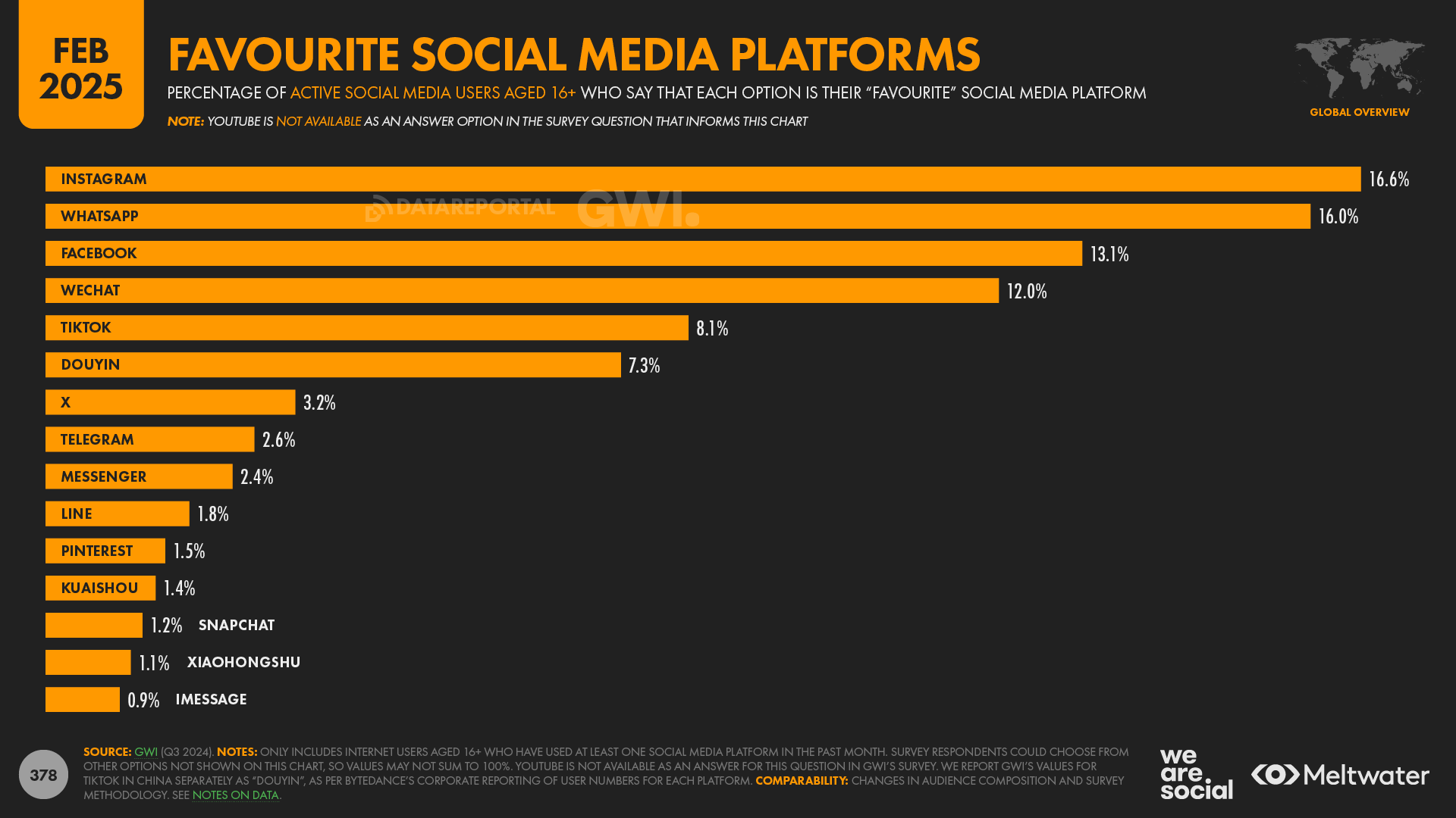 หากพิจารณาความชื่นชอบของผู้ใช้งานตามข้อมูลการวิเคราะห์จาก GWI พบว่า Instagram เป็นแพลตฟอร์มยอดนิยมอันดับ 1 โดย 16.6% ของผู้ใช้กลุ่มผู้ใหญ่ระบุว่า ชื่นชอบ Instagram มากที่สุด ตามมาด้วย WhatsApp ในสัดส่วน 16% และ Facebook ที่ 13.1% ขณะที่ WeChat อยู่อันดับ 4 ที่ 12% (ส่วนใหญ่มาจากความนิยมในจีน โดยมีเพียง 0.2% ของผู้ใช้ในต่างประเทศที่ชื่นชอบ WeChat มากที่สุด) และ TikTok อยู่อันดับ 5 ที่ 8.1%