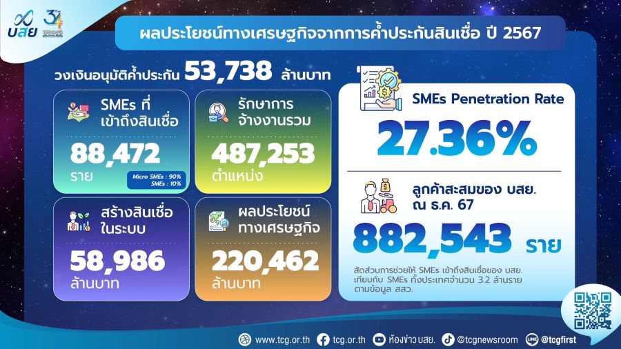 นายสิทธิกร ดิเรกสุนทร กรรมการและผู้จัดการทั่วไป บรรษัทประกันสินเชื่ออุตสาหกรรมขนาดย่อม (บสย.) เปิดเผยถึงผลการดำเนินงานในปี 2567 ว่า บสย. มียอดค้ำประกันสินเชื่อ 53,738 ล้านบาท ช่วย SMEs ได้รับสินเชื่อ 88,472 ราย โดยในจำนวนนี้ เป็นผู้ประกอบการรายย่อย (Micro SMEs) 90% ค้ำประกันเฉลี่ย 100,000 บาทต่อราย อีก 10% เป็น SMEs ทั่วไป ค้ำประกันเฉลี่ย 4.96 ล้านบาทต่อราย ก่อให้เกิดสินเชื่อในระบบสถาบันการเงิน 58,986 ล้านบาท รักษาการจ้างงาน 487,253 ตำแหน่ง และสร้างผลประโยชน์ทางเศรษฐกิจได้มากกว่า 220,462 ล้านบาท