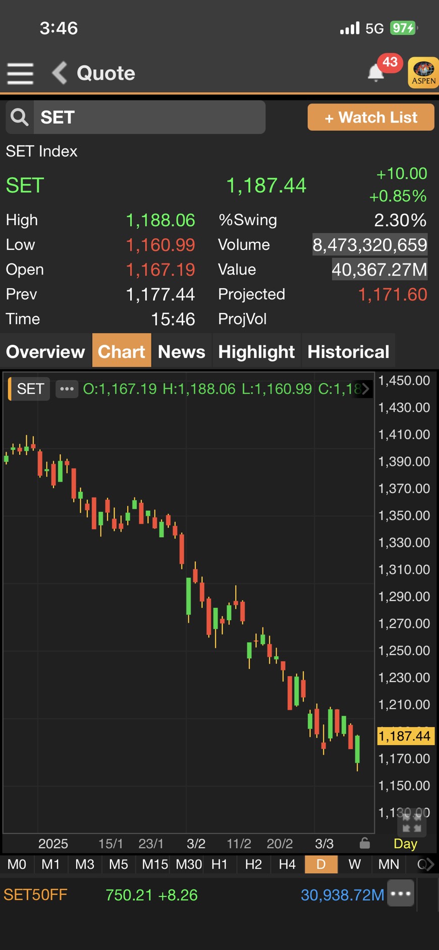 เมื่อเวลา 15.46 น. ดัชนี SET มาอยู่ที่ 1,187.44 จุด เพิ่มขึ้น 10.00 จุด (+0.85%)