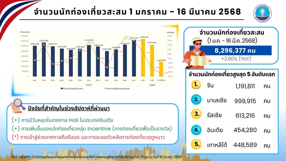 นายสรวงศ์ เทียนทอง รมว.ท่องเที่ยวและกีฬา กล่าวถึงภาพรวมสถานการณ์ท่องเที่ยวไทยว่า ตั้งแต่วันที่ 1 ม.ค.-16 มี.ค. 68 มีนักท่องเที่ยวชาวต่างชาติเดินทางเข้าไทย สะสมทั้งสิ้น 8,296,377 คน สร้างรายได้จากการใช้จ่ายของนักท่องเที่ยวต่างชาติแล้ว ประมาณ 405,946 ล้านบาท โดยจำนวนนักท่องเที่ยวสูงสุด 5 อันดับแรก ได้แก่ จีน 1,191,811 คน มาเลเซีย 999,915 คน รัสเซีย 613,216 คน อินเดีย 454,280 คน และเกาหลีใต้ 448,589 คน