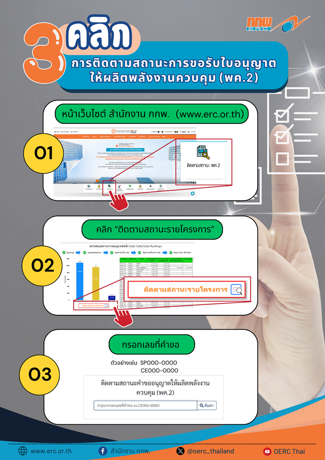 สำหรับช่องทางและขั้นตอนการตรวจสอบสถานะ สามารถเข้าไปตรวจสอบได้ที่เว็บไซต์ของสำนักงาน กกพ. ที่ www.erc.or.th และเข้าไปตรวจสอบได้ที่เมนู “ติดตามสถานะ พค.2” และคลิกไปที่ “ติดตามสถานะรายโครงการ” เพื่อค้นหาสถานะโครงการ โดยจะมีข้อมูลประกอบด้วย ชื่อผู้ขอรับใบอนุญาต (ชื่อโครงการ), ที่ตั้งสถานประกอบกิจการ, ประเภทเชื้อเพลิงหรือเทคโนโลยี, ประเภทการติดตั้ง, ขนาดกำลังการผลิตติดตั้ง และสถานะการดำเนินงานในแต่ละขั้นตอนนับตั้งแต่ยื่นคำขอ
