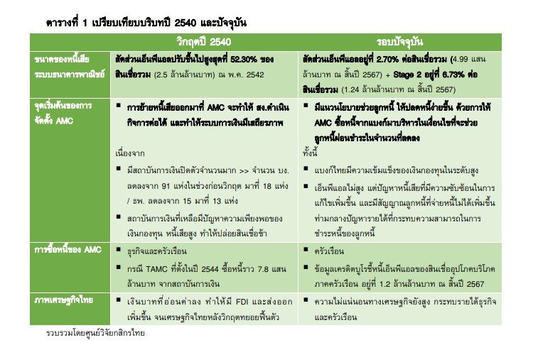 ทั้งนี้ในช่วงวิกฤตต้มยำกุ้งและในครั้งนี้ มีความเหมือนกันตรงที่การมุ่งแยกหนี้เสียออกจากระบบ แต่กลับอยู่บนเงื่อนไขของเศรษฐกิจการเงินที่แตกต่างกัน ในช่วงวิกฤตปี 2540 การจัดตั้ง AMC จะเน้นซื้อหนี้ทั้งธุรกิจและครัวเรือน ซึ่งการฟื้นตัวของเศรษฐกิจหลังวิกฤตจากอานิสงส์ของเงินบาทอ่อนค่าที่ส่งผลดีต่อ FDI และการส่งออกได้ช่วยให้ธุรกิจและครัวเรือนเห็นภาพรายได้ที่ดีขึ้น