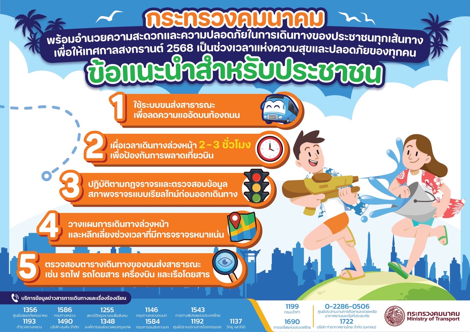 นายสุริยะ จึงรุ่งเรืองกิจ รองนายกรัฐมนตรี และรมว.คมนาคม เปิดเผยว่า กระทรวงคมนาคมได้เปิดศูนย์ปฏิบัติการความปลอดภัยคมนาคม (ศปภ.คค.) ระหว่างวันที่ 11 – 18 เมษายน 2568 โดยบูรณาการกับหน่วยงานในสังกัดด้านข้อมูลการเดินทางด้วยระบบ CCTV จาก 8 หน่วยงาน 454 กล้อง ในทุกโหมดการเดินทาง เพื่อติดตามข้อมูลสภาพจราจร ความหนาแน่นของผู้โดยสารและข้อมูลด้านความปลอดภัย พร้อมดำเนินการสืบสวนอุบัติเหตุในช่วงเวลาดังกล่าว และหากเกิดเหตุจะมีการบัญชาการผ่านระบบออนไลน์เพื่อบริหารจัดการเหตุการณ์อย่างทันท่วงที โดยตั้งเป้าหมายลดจำนวนอุบัติเหตุ ผู้เสียชีวิต ผู้บาดเจ็บ ตลอดจนจำนวนรถโดยสารสาธารณะที่เกิดอุบัติเหตุให้ลดลง 5% เมื่อเทียบกับค่าเฉลี่ยในช่วงเวลาเดียวกันย้อนหลัง 3 ปี