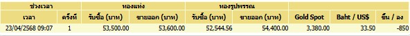 โดยสมาคมค้าทองคำ รายงานราคาทอง เมื่อเวลา 09.07 น. (ครั้งที่ 1)