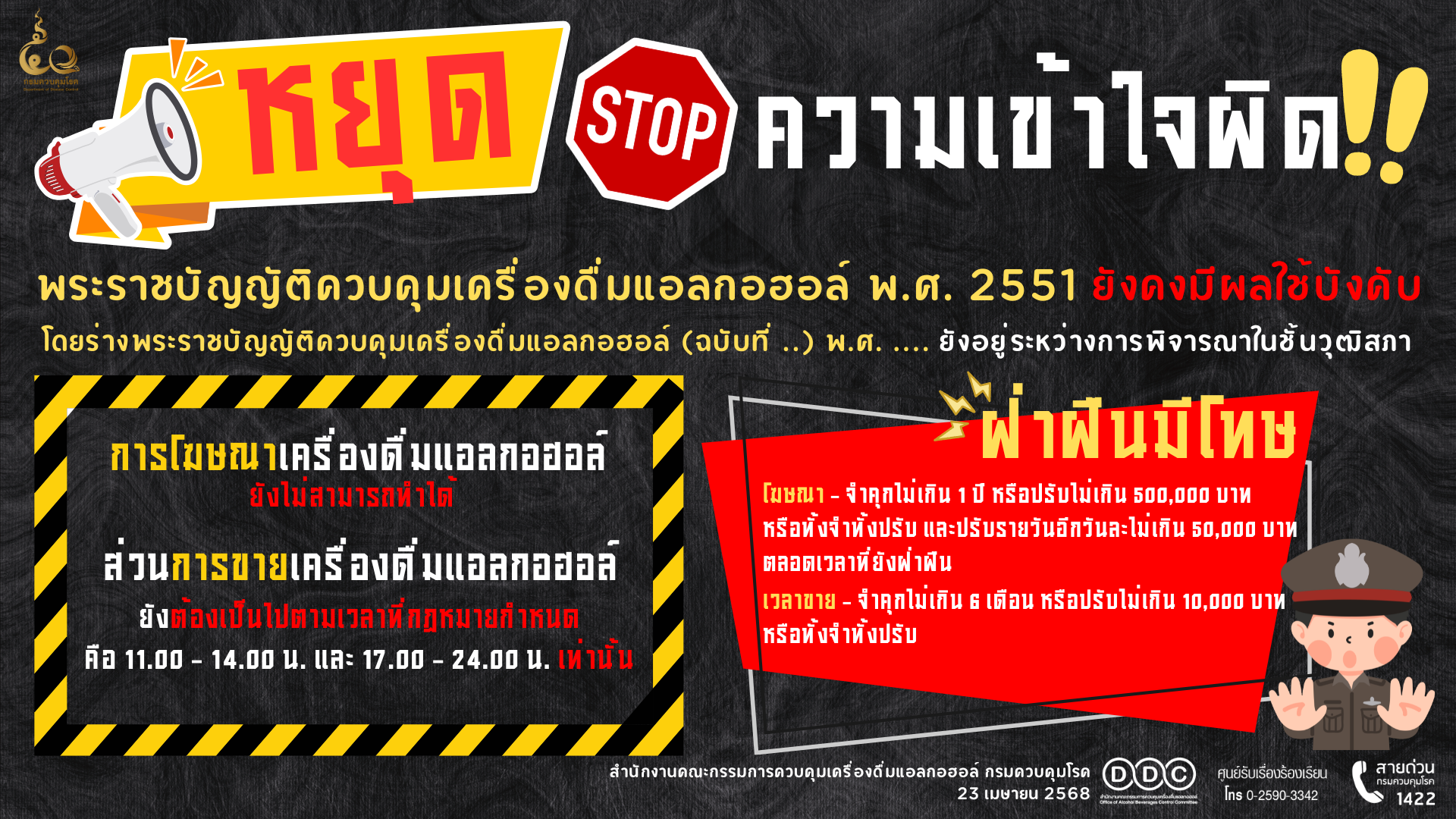 ดังนั้นประชาชนรวมถึงผู้ประกอบการยังคงต้องปฏิบัติตามหลักการใน พ.ร.บ.ควบคุมเครื่องดื่มแอลกอฮอล์ พ.ศ.2551 และระมัดระวังไม่กระทำการที่อาจเข้าข่ายเป็นความผิด ทั้งในเรื่องการฝ่าฝืนมาตรการควบคุมการโฆษณาเครื่องดื่มแอลกอฮอล์ หากฝ่าฝืนมีโทษจำคุกไม่เกิน 1 ปี หรือปรับไม่เกิน 500,000 บาท หรือทั้งจำทั้งปรับ และมีโทษปรับรายวันอีก วันละไม่เกิน 50,000 บาท ตลอดเวลาที่ยังฝ่าฝืน หรือจนกว่าจะได้ปฏิบัติให้ถูกต้อง