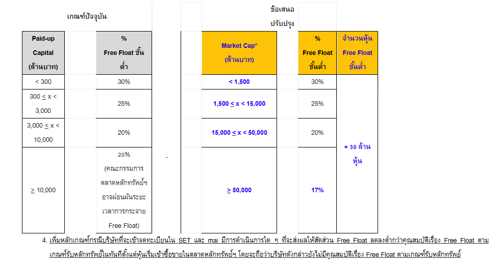 – ปรับปรุงสัดส่วน Free Float จากขั้นต่ำ 20% เป็นขั้นต่ำ 17% สำหรับบริษัทขนาดใหญ่ เพื่อส่งเสริมบริษัทขนาดใหญ่เข้าจดทะเบียน ซึ่งยังคงเป็นสัดส่วน Free Float ที่สูงกว่าเกณฑ์ดำรงสถานะการเป็นบริษัทจดทะเบียนที่ขั้นต่ำ 15%