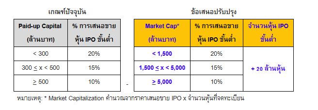 2.เกณฑ์การเสนอขายหุ้น IPO : ปรับปรุงการแบ่งกลุ่มขนาดของบริษัท (Tier) ด้วยการใช้ Market Capitalization แทนการแบ่งด้วย Paid-up Capital เพื่อให้สอดคล้องกับเกณฑ์ Free Float และกำหนดจำนวนหุ้น IPO ขั้นต่ำที่ 20 ล้านหุ้น