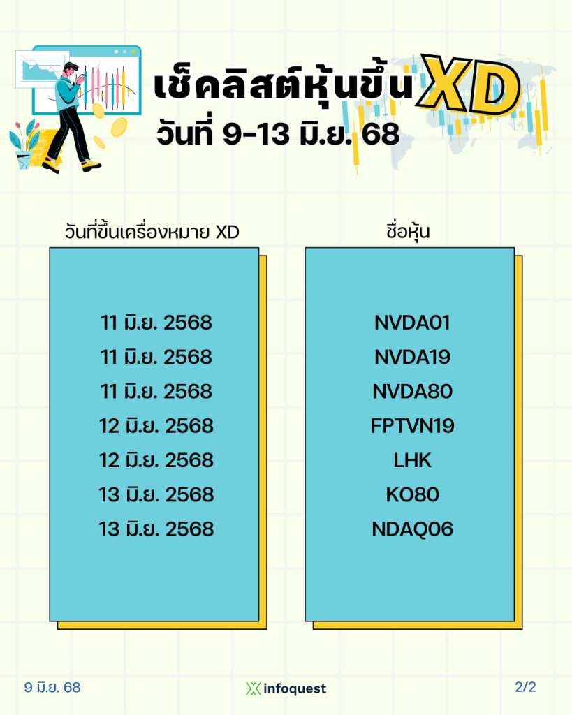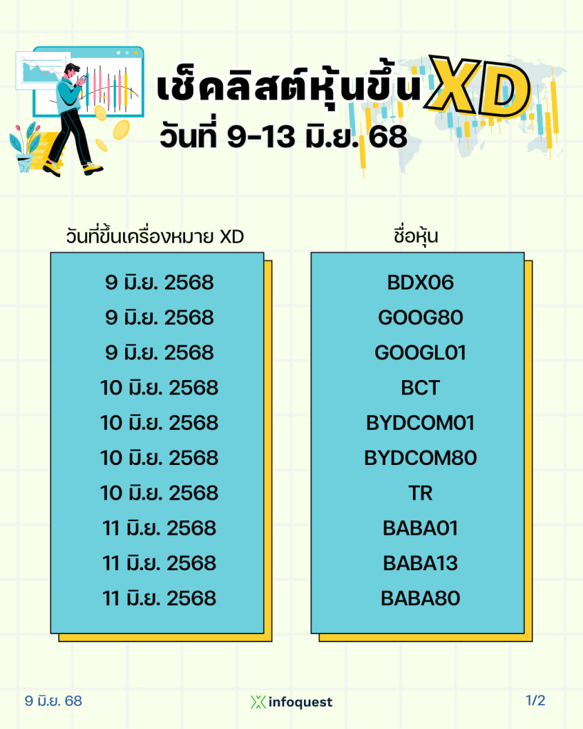 สรุปชื่อหุ้นที่ขึ้นเครื่องหมาย XD ระหว่างวันที่ 9 – 13 มิถุนายน 2568 ซึ่งรวบรวมข้อมูลจากบริษัทจดทะเบียนแจ้งตลาดหลักทรัพย์ฯ