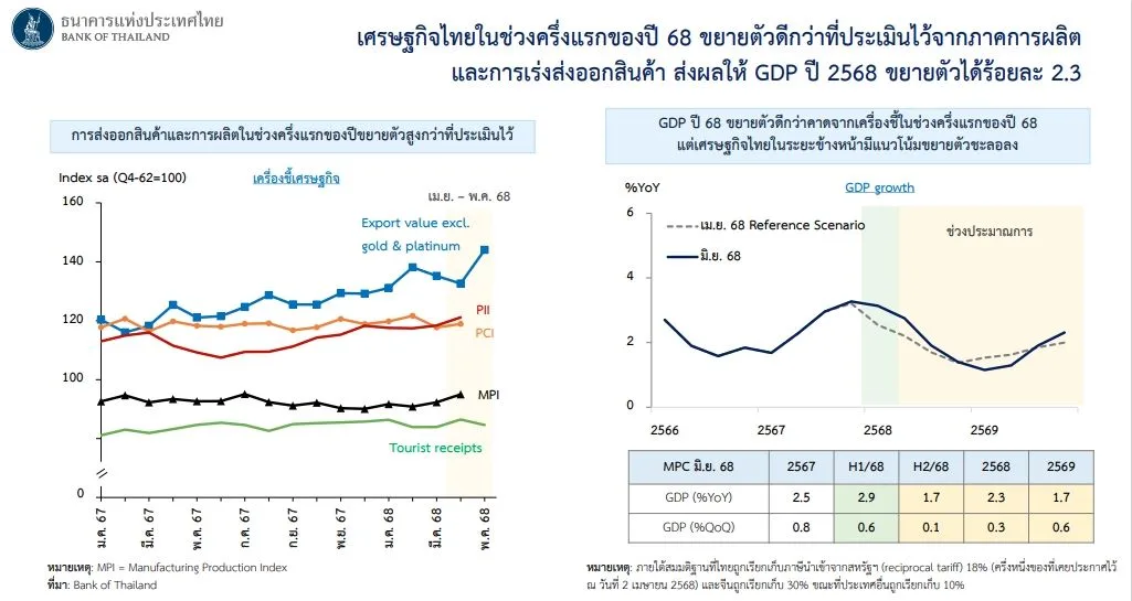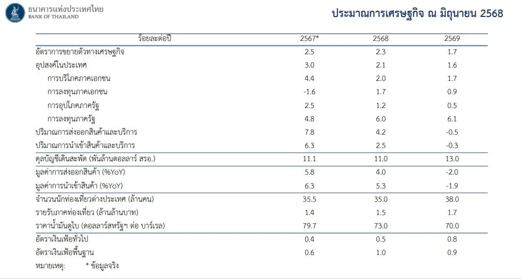 สำหรับประมาณการเศรษฐกิจไทยที่สำคัญในปีนี้ คาดว่า มูลค่าการส่งออก ปีนี้โต 4% ส่วนปี 69 หดตัว -2%, อัตราเงินเฟ้อปีนี้ 0.5% ปีหน้า 0.8%, จำนวนนักท่องเที่ยวต่างชาติ ปีนี้ 35 ล้านคน ปีหน้า 38 ล้านคน, ดุลบัญชีเดินสะพัด ปีนี้ เกินดุล 11 พันล้านดอลลาร์ ปีหน้า เกินดุล 13 พันล้านดอลลาร์
