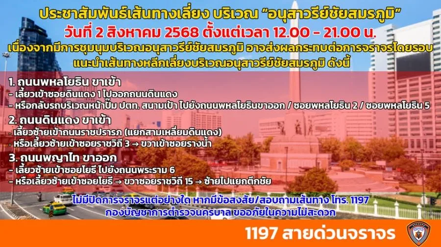ด้านกองบัญชาการตำรวจนครบาล (บช.น.) ระบุว่า ในเบื้องต้นจะยังไม่ปิดการจราจร พร้อมแนะเส้นทางหลีกเลี่ยงบริเวณอนุสาวรีย์ชัยสมรภูมิ ดังนี้
