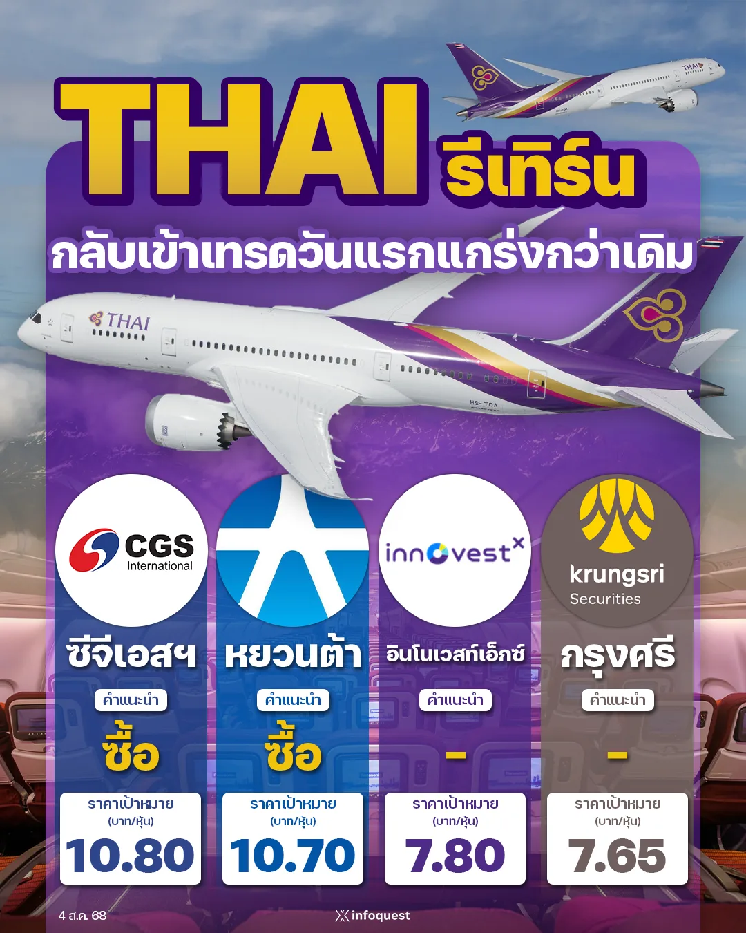 นายดิษฐนพ เคาะราคาเป้าหมายหุ้น THAI ที่ 7.65 บาท ซึ่งมี EV/EBITDA 4.5 เท่า และ P/E 9.8 เท่า อิงสายการบินในภูมิภาค หากราคาเปิด (4 ส.ค.) ต่ำกว่าราคาเป้าหมาย เรามองเป็นโอกาสเข้าลงทุน ด้วยผลประกอบการฟื้นตัวดีมาก และคาดกำไรปกติปี 68 อยู่ที่ 2.6 หมื่นล้านบาท