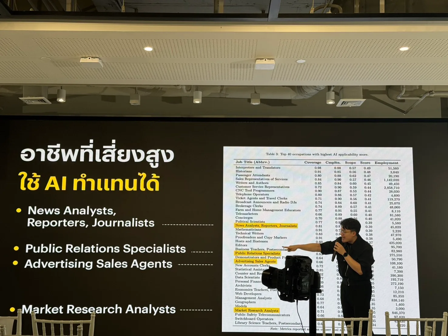 คุณบอย เล่าให้ฟังในงาน Brand Inside Open House 2025 ว่า AI กำลังเข้ามามีบทบาทสำคัญในวงการสื่อและโฆษณา อาชีพที่เคยต้องใช้ทักษะสูง เช่น นักวิเคราะห์ข่าว, ผู้รายงานข่าว, นักข่าว, PR Specialist, Advertising Agent, และนักวิจัยด้านการตลาด ล้วนอยู่ในกลุ่มเสี่ยงสูงที่ AI สามารถทำงานแทนได้ ซึ่งผลลัพธ์ที่ตามมาในที่สุด คือ “ตกงาน”
