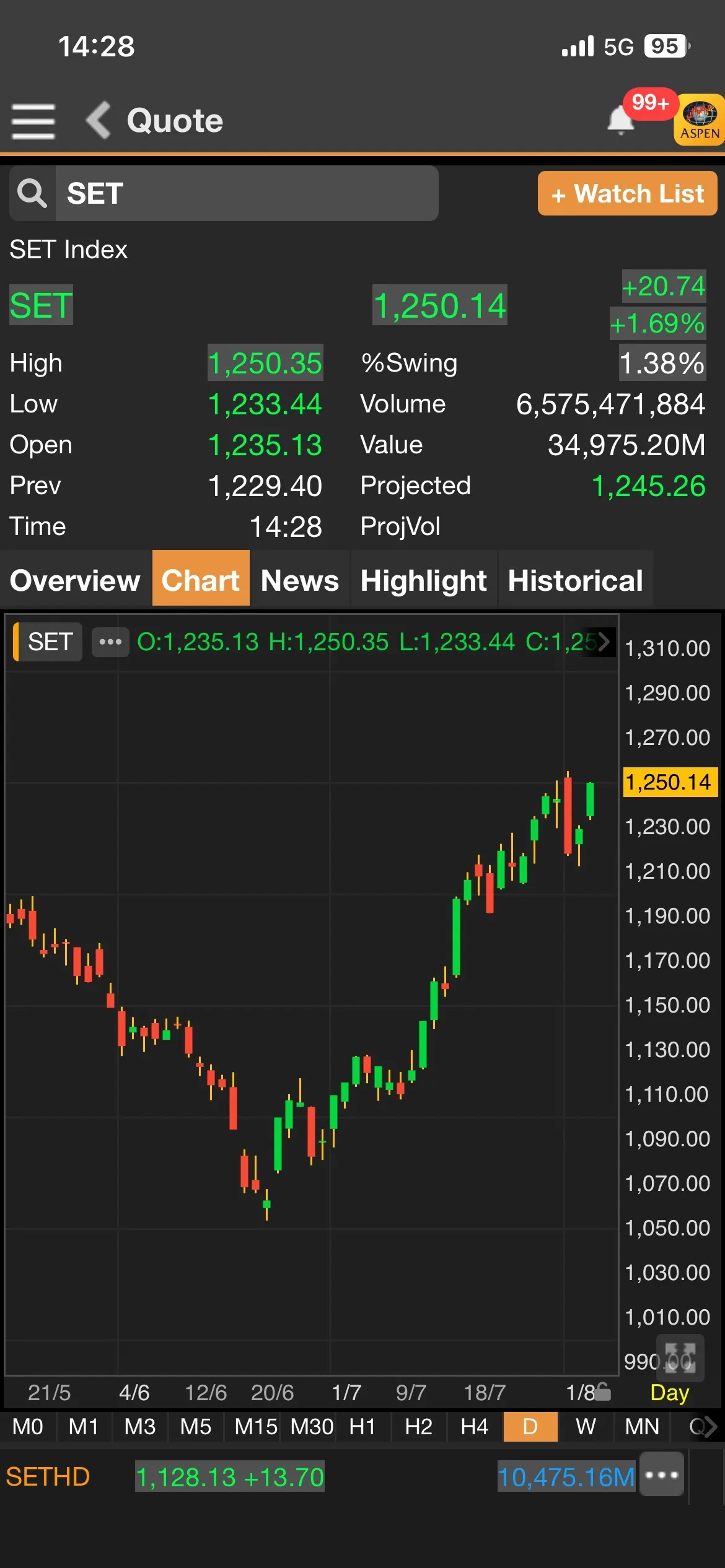 - เมื่อเวลา 14.26 น. ดัชนี SET มาอยู่ที่ 1,250.14 จุด เพิ่มขึ้น 20.74 จุด (+1.69%)