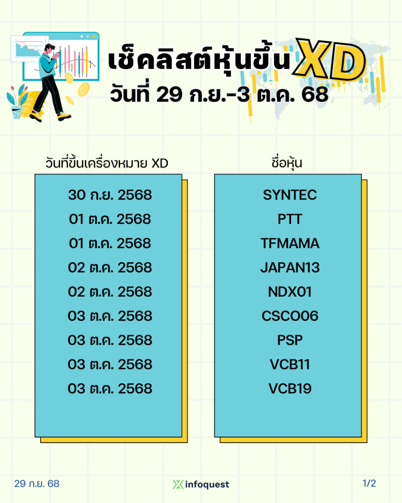 สรุปชื่อหุ้นที่ขึ้นเครื่องหมาย XD ระหว่างวันที่ 29 กันยายน – 3 ตุลาคม 2568 ซึ่งรวบรวมข้อมูลจากบริษัทจดทะเบียนแจ้งตลาดหลักทรัพย์ฯ