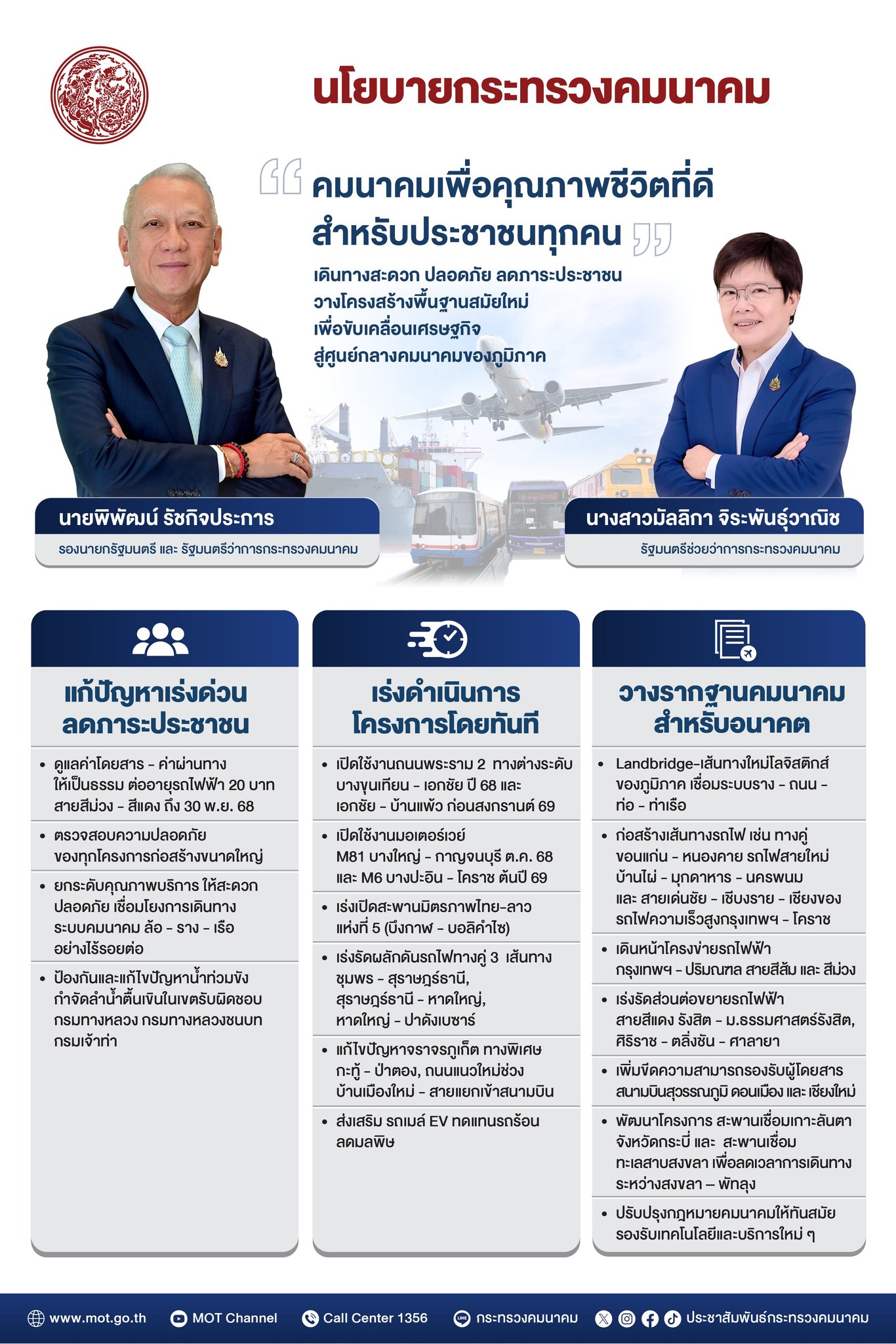 สิ่งแรกที่กระทรวงคมนาคมจะเร่งดำเนินการ คือ มาตรการลดภาระค่าใช้จ่ายของประชาชนทันที โดยการขยายมาตรการรถไฟฟ้า 20 บาทตลอดสาย ทั้งสายสีแดง และสายสีม่วง ไปจนถึงวันที่ 30 พ.ย.68 ควบคู่กับการเข้มงวดในการตรวจสอบความปลอดภัยในทุกโครงการก่อสร้างขนาดใหญ่ในทุกโครงการ เพื่อสร้างความปลอดภัยอันสูงสุดต่อชีวิตและทรัพย์สินของประชาชน พร้อมยกระดับคุณภาพการบริการระบบคมนาคมทั้งระบบทั้ง “ทางบก ทางราง ทางน้ำ และทางอากาศ” ให้เชื่อมโยงกันอย่างไร้รอยต่อ