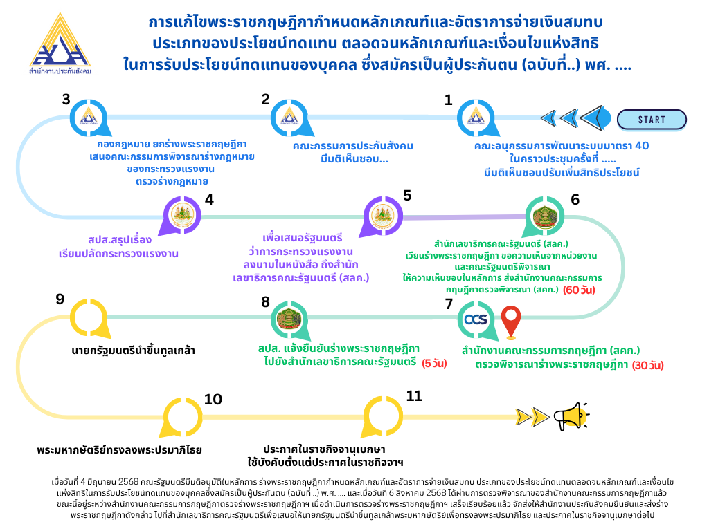 “ไทม์ไลน์หลังจากที่ ครม.ได้อนุมัติหลักการร่าง พ.ร.ฎ.เมื่อวันที่ 4 มิ.ย.แล้ว และได้ผ่านการตรวจพิจารณาของสำนักงานคณะกรรมการกฤษฎีกาแล้ว ขณะนี้อยู่ระหว่างสำนักงานคณะกรรมการกฤษฏีกาตรวจร่าง พ.ร.ฎ. หากเสร็จเรียบร้อยแล้วจะส่งให้สำนักงานประกันสังคมยืนยันและส่งร่าง พ.ร.ฎ.ดังกล่าวไปที่สำนักเลขาธิการคณะรัฐมนตรี เพื่อเสนอให้นายกรัฐมนตรีนำขึ้นทูลเกล้าฯ เพื่อทรงลงพระปรมาภิไธย และประกาศในราชกิจจานุเบกษาต่อไป” นายสิริพงศ์ กล่าว