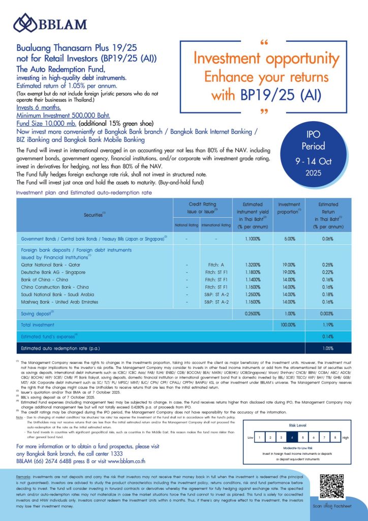 บลจ.บัวหลวง (BBLAM) เปิดเสนอขายหน่วยลงทุนครั้งแรก (IPO) กองทุนรวมบัวหลวงธนสารพลัส 19/25 ห้ามขายผู้ลงทุนรายย่อย หรือ BP19/25(AI) ระหว่างวันที่ 9-14 ตุลาคม 2568 ประมาณการผลตอบแทน 1.05% ต่อปี โดยเสนอขายในราคา 10 บาทต่อหน่วย และผู้ลงทุนจะต้องจองซื้อครั้งแรกขั้นต่ำ 500,000 บาท