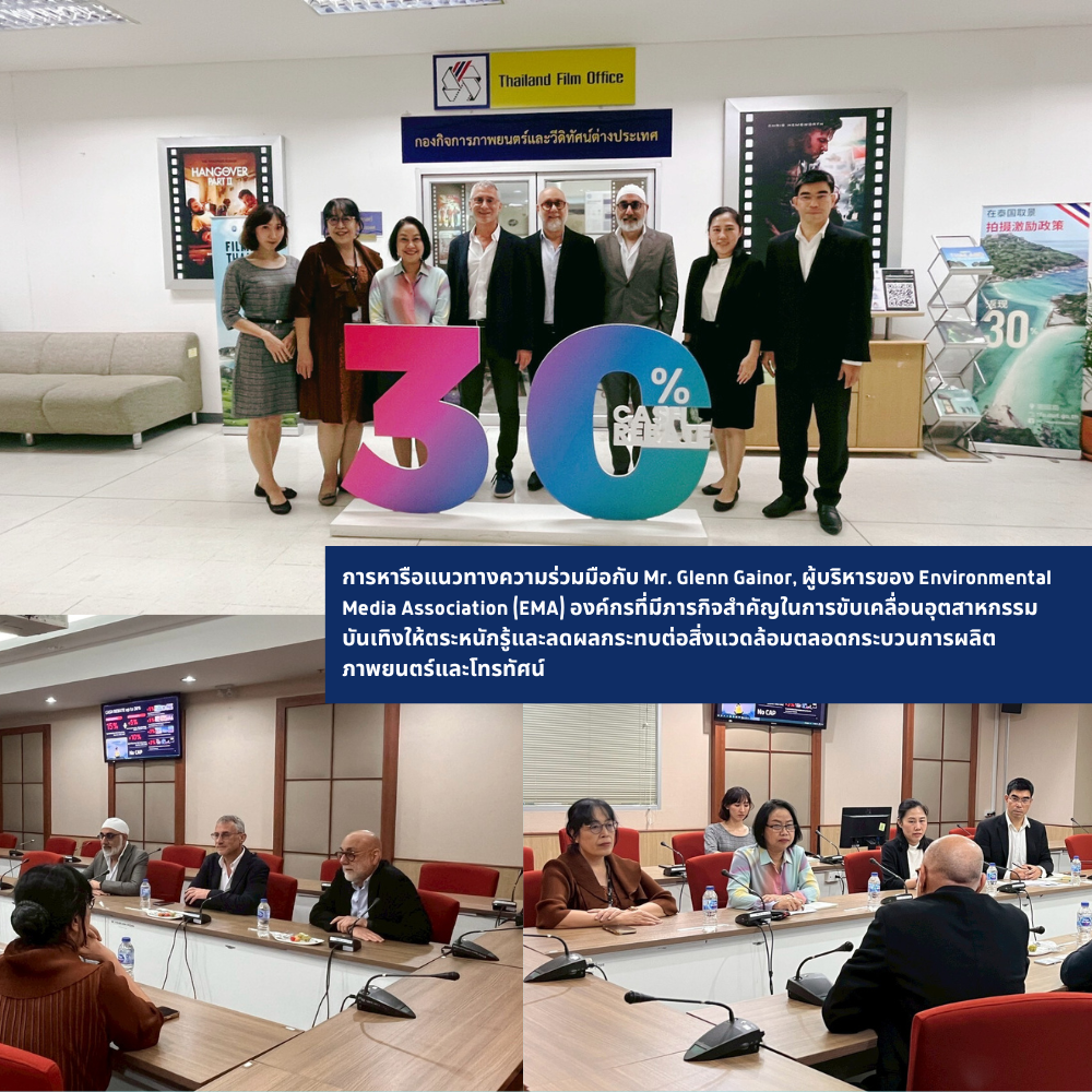 ล่าสุด กองกิจการภาพยนตร์ฯ ได้หารือแนวทางความร่วมมือกับ Mr. Glenn Gainor หนึ่งในกรรมการบริหาร ของ Environmental Media Association (EMA) องค์กรที่มีภารกิจสำคัญในการขับเคลื่อนอุตสาหกรรมบันเทิงให้ตระหนักรู้และลดผลกระทบต่อสิ่งแวดล้อมตลอดกระบวนการผลิตภาพยนตร์และโทรทัศน์ โดย EMA เป็นผู้นำ ในการพัฒนาแนวทาง “Green Seal” หรือมาตรฐานรับรองกองถ่ายสีเขียว และ “Gold Seal” ที่ได้รับการยอมรับจากสตูดิโอภาพยนตร์และผู้ผลิตระดับโลกในฝั่งฮอลลีวู้ด