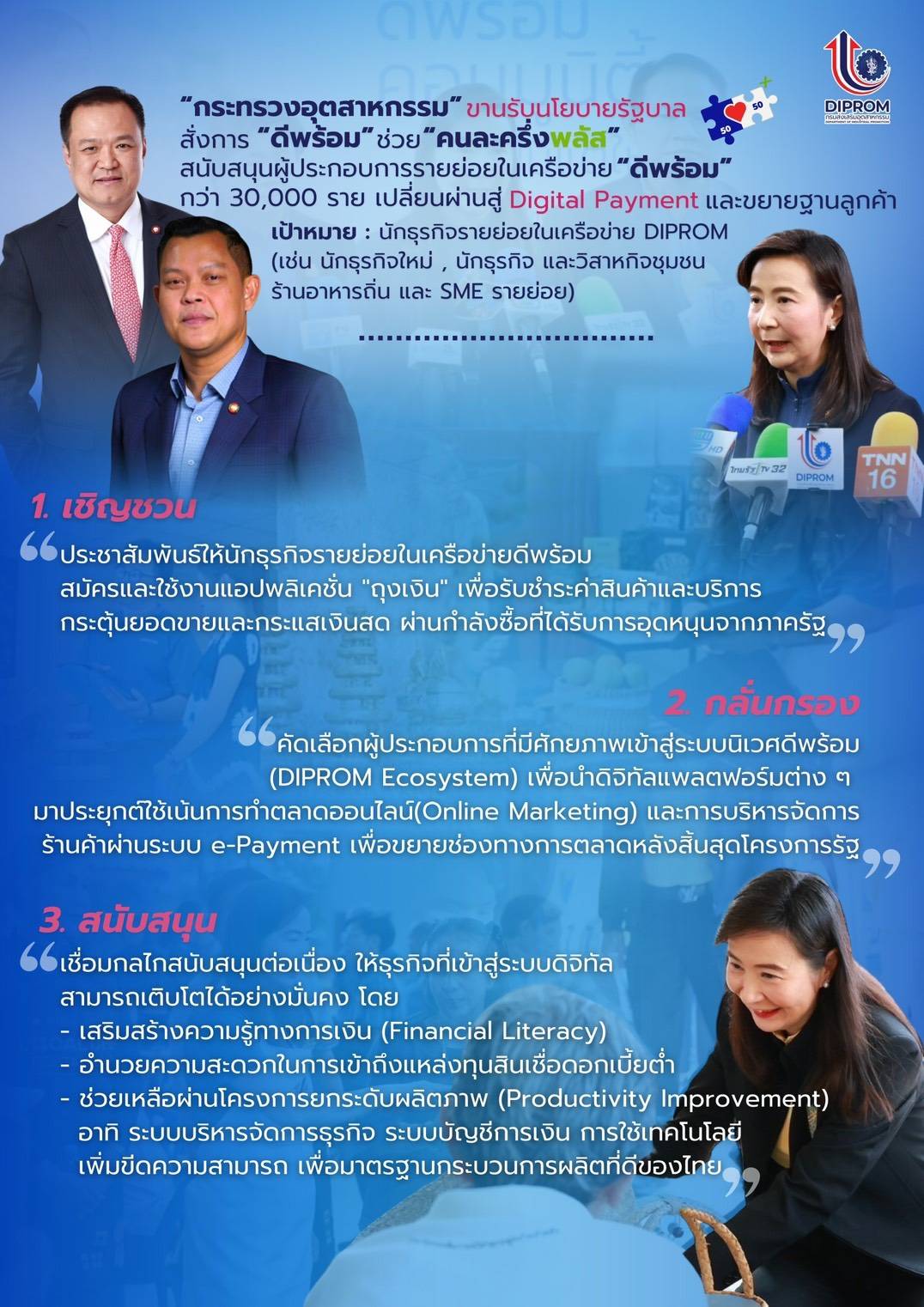 สำหรับนักธุรกิจรายย่อยในเครือข่าย DIPROM เช่น นักธุรกิจใหม่ นักธุรกิจ และวิสาหกิจชุมชน ร้านอาหารถิ่น และ SME รายย่อย กระทรวงฯ จะดำเนินการผ่าน 3 ยุทธ์ศาสตร์สำคัญ คือ 1.เชิญชวน โดยประชาสัมพันธ์ให้นักธุรกิจรายย่อยในเครือข่ายดีพร้อม สมัครและใช้งานแอปพลิเคชั่น “ถุงเงิน” เพื่อรับชำระค่าสินค้าและบริการ กระตุ้นยอดขายและกระแสเงินสด ผ่านกำลังซื้อที่ได้รับการอุดหนุนจากภาครัฐ 2.กลั่นกรอง โดยคัดเลือกผู้ประกอบการที่มีศักยภาพเข้าสู่ระบบนิเวศดีพร้อม (DIPROM Ecosystem) เพื่อนำดิจิทัลแพลตฟอร์มต่าง ๆ มาประยุกต์ใช้ เน้นการทำตลาดออนไลน์ (Online Marketing) และการบริหารจัดการ ร้านค้าผ่านระบบ e-Payment เพื่อขยายช่องทางการตลาดหลังสิ้นสุดโครงการรัฐ และ 3.สนับสนุน โดยเชื่อมกลไกสนับสนุนต่อเนื่องให้ธุรกิจที่เข้าสู่ระบบดิจิทัล สามารถเติบโตได้อย่างมั่นคง