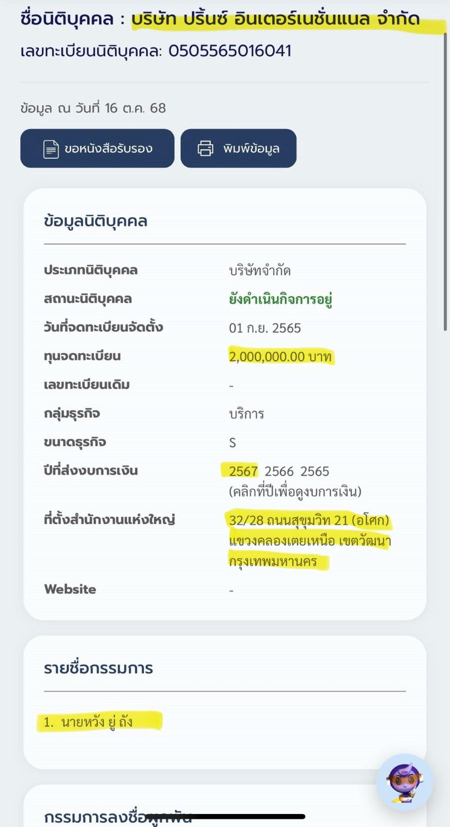 ทั้งนี้บริษัทมีกรรมการ 1 คน เป็นคนจีน และ ถ้าดูจากทุนจดทะเบียน 2 ล้าน และงบการเงินปี 67 คิดว่าเป็นไปไม่ได้ที่จะลงทุนในโครงการอสังหาใหญ่ ๆ ของเจ้าดังในไทยตามที่ระบุบนเว็บไซต์ อาจเป็นการแอบอ้างมากกว่า ซึ่งบริษัทอสังหาที่โดนแอบอ้าง ควรต้องรีบทำเรื่องฟ้อง Prince International
