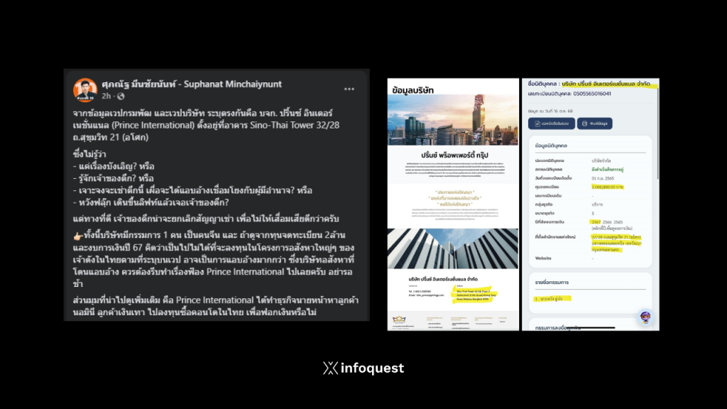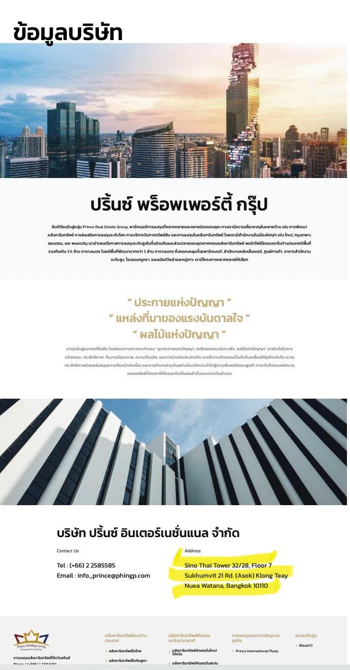 นายศุภณัฐ มีนชัยนันท์ ส.ส.กทม.พรรคประชาชน โพสต์เพจเฟซบุ๊กส่วนตัว ระบุว่า จากข้อมูลเว็บไซต์กรมพัฒนาธุรกิจการค้า และเว็บไซต์บริษัท ระบุตรงกันคือ บจก. ปริ้นซ์ อินเตอร์เนชั่นแนล (Prince International) ตั้งอยู่ที่อาคาร Sino-Thai Tower 32/28 ถ.สุขุมวิท 21 (อโศก) พร้อมแนะเจ้าของตึกน่าจะยกเลิกสัญญาเช่าเพื่อไม่ให้เสื่อมเสีย