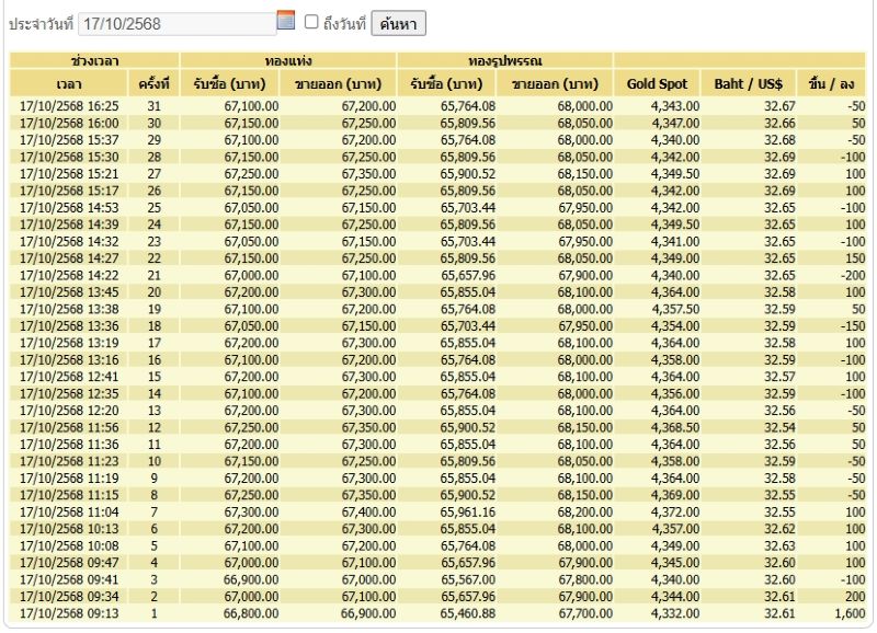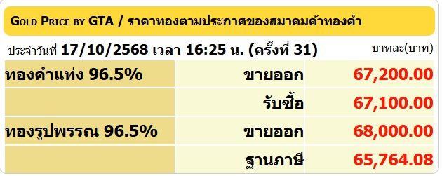 ราคาทองคำ (96.5%) ขายปลีกในประเทศวันนี้ค่อนข้างผันผวน ซึ่งตลอดทั้งวันมีการปรับราคาขึ้น-ลง รวมทั้งหมด 31 ครั้ง รวมทั้งวันปรับขึ้น 1,900 บาท โดยเมื่อเวลา 11.04 น. ราคาทองรูปพรรณ ขึ้นไปทะลุระดับ 68,000 บาท/บาททองคำ โดยราคาขายออกอยู่ที่ 68,200 บาท
