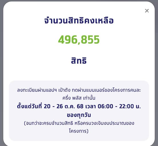 อย่างไรก็ดี สำหรับประชาชนที่ลงทะเบียนสำเร็จแล้ว จะสามารถใช้จ่ายตามโครงการ “คนละครึ่ง พลัส” ได้ตั้งแต่วันที่ 29 ต.ค.-31 ธ.ค.68 ทั้งนี้ กระทรวงการคลัง เน้นย้ำว่า ขอให้ประชาชนเปิด “ใช้สิทธิครั้งแรก” ภายในวันที่ 11 พ.ย. ก่อนเวลา 23.00 น. เพื่อไม่ให้ถูกตัดสิทธิตามเงื่อนไขโครงการ
