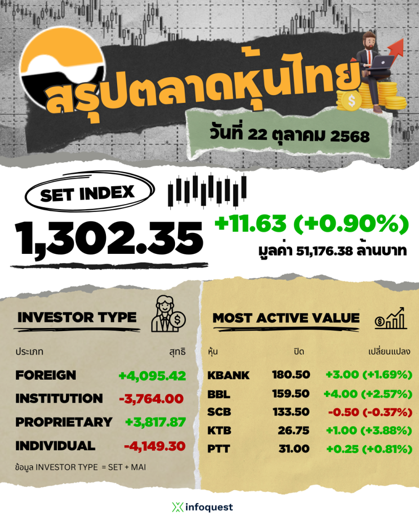 - SET ปิดวันนี้ที่ 1,302.35 จุด เพิ่มขึ้น 11.63 จุด (+0.90%) มูลค่าซื้อขาย 51,176.38ล้านบาท