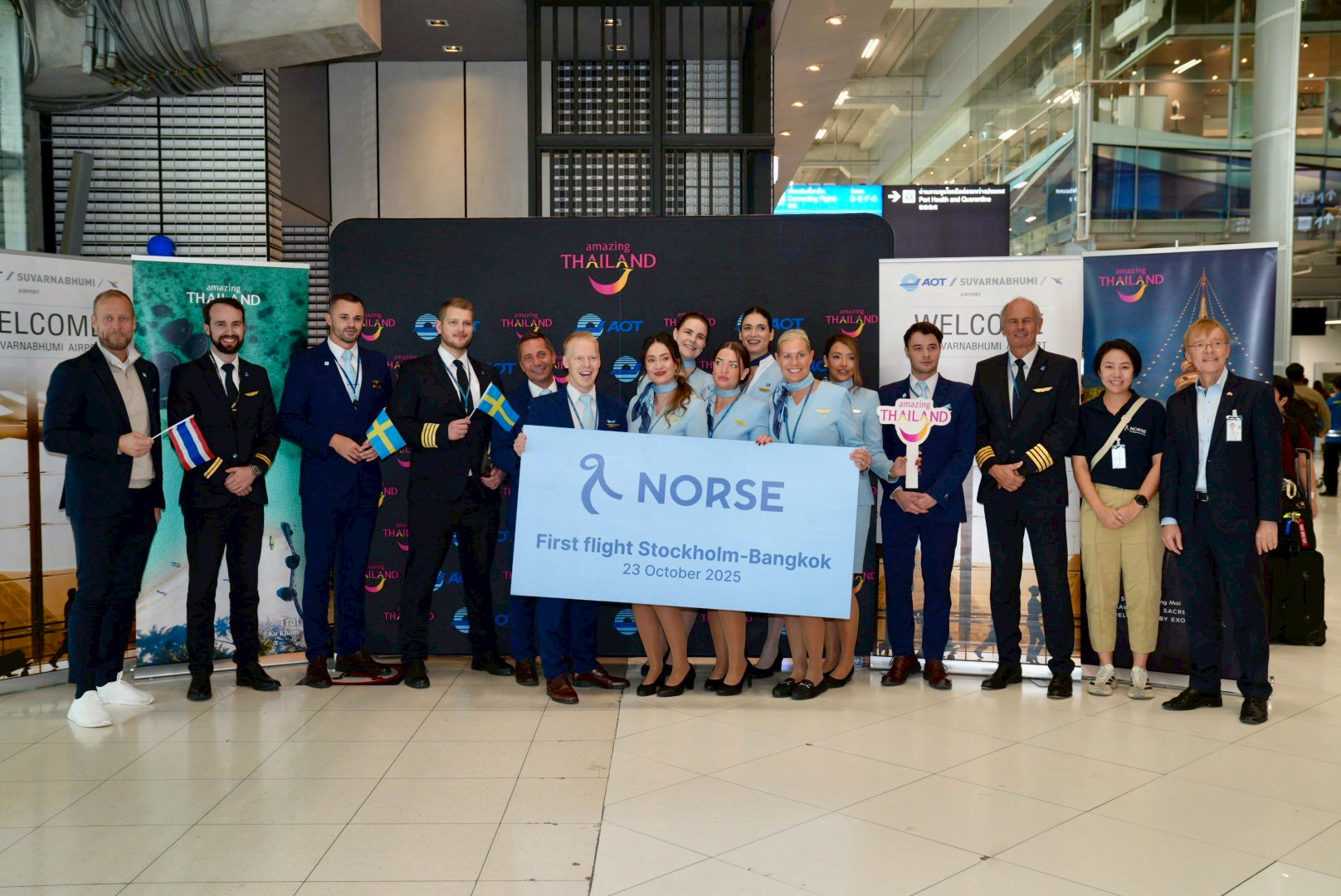 สำหรับเที่ยวบินแรก NO191 เส้นทางสตอกโฮล์ม (ARN) – กรุงเทพฯ (BKK) ที่เดินทางมาถึงประเทศไทย ททท. ได้จัดพิธีต้อนรับเที่ยวบินปฐมฤกษ์อย่างอบอุ่น โดยผู้บริหาร ททท. และผู้แทนสายการบิน Norse Atlantic Airways Mr. Bård Nordhagen, Chief Commercial Officer (CCO)ร่วมมอบของที่ระลึกแก่นักท่องเที่ยวจากเที่ยวบินดังกล่าว ซึ่งออกเดินทางจากท่าอากาศยานสตอกโฮล์ม-อาร์ลันดา ราชอาณาจักรสวีเดน เวลา 18.25 น. และถึงท่าอากาศยานสุวรรณภูมิ กรุงเทพฯ ในวันที่ 23 ตุลาคม เวลา 10.35 น. เที่ยวบินเส้นทางนี้จะเริ่มให้บริการตั้งแต่วันที่ 22 ตุลาคม 2568 เป็นต้นไป สัปดาห์ละ 2 เที่ยวบินในระยะเริ่มต้น และเพิ่มเป็น 4 เที่ยวต่อสัปดาห์ตั้งแต่เดือนธันวาคม 2568 โดยให้บริการด้วยเครื่องบินโบอิ้ง 787-9 ดรีมไลเนอร์ ที่มีที่นั่งชั้นพรีเมียม 56 ที่นั่ง และชั้นประหยัด 282 ที่นั่งเพื่อมอบประสบการณ์การเดินทางที่สะดวกสบายแก่ผู้โดยสารจากยุโรปสู่ประเทศไทยในช่วงฤดูท่องเที่ยวปลายปี