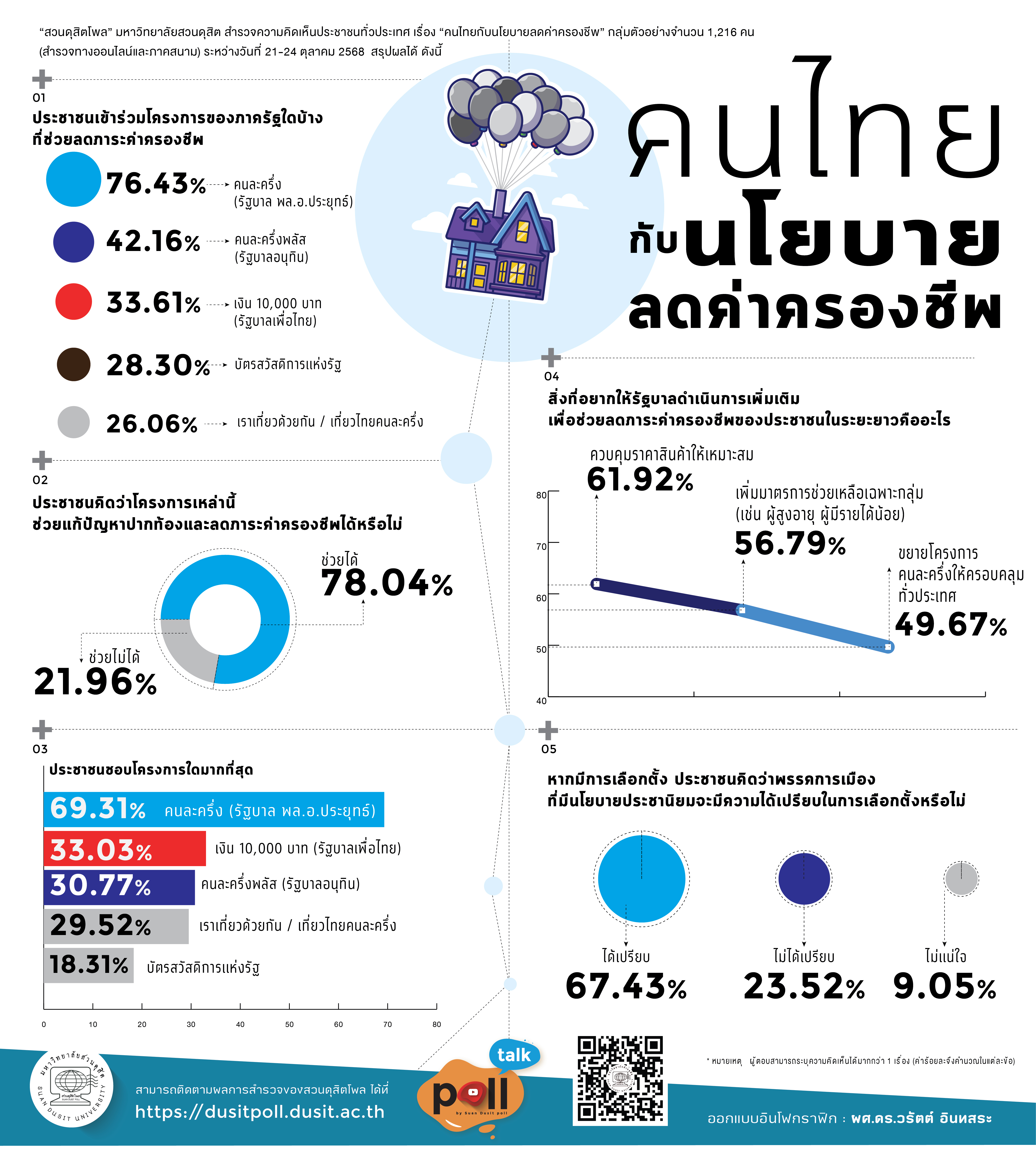 “สวนดุสิตโพล” มหาวิทยาลัยสวนดุสิต เผยผลสำรวจความคิดเห็นประชาชนเรื่อง “คนไทยกับนโยบายลดค่าครองชีพ” ที่ได้จากการสุ่ม กลุ่มตัวอย่างทั่วประเทศจำนวน 1,216 คน (สำรวจทางออนไลน์และภาคสนาม) ระหว่างวันที่ 21-24 ต.ค.68 โดยกลุ่มตัวอย่างส่วนใหญ่เข้าร่วมโครงการของภาครัฐที่ช่วยลดภาระค่าครองชีพ คือ คนละครึ่ง (รัฐบาล พล.อ.ประยุทธ์) 76.43% และเห็นว่าโครงการเหล่านี้ช่วยแก้ปัญหาปากท้องและลดภาระค่าครองชีพได้ 78.04% ซึ่งจากโครงการช่วยเหลือต่าง ๆ โครงการที่ชอบมากที่สุด คือ คนละครึ่ง (รัฐบาล พล.อ.ประยุทธ์) 69.31% ในระยะยาวเพื่อลดภาระค่าครองชีพอยากให้รัฐบาลควบคุมราคาสินค้าให้เหมาะสม 61.92% ทั้งนี้หากมีการเลือกตั้งคิดว่าพรรคการเมืองที่มีนโยบายประชานิยมจะได้เปรียบ 67.43%