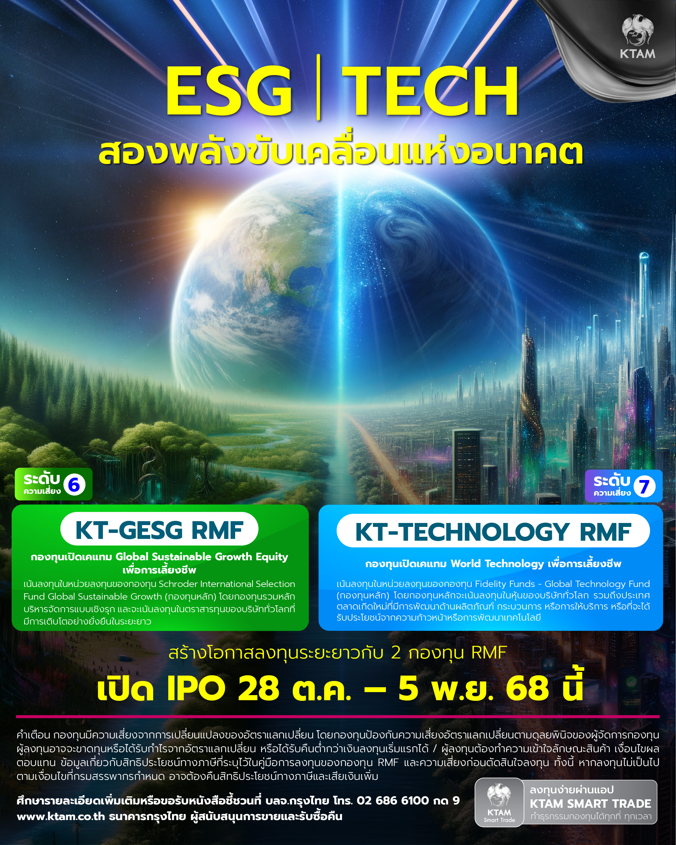 นางชวินดา หาญรัตนกูล กรรมการผู้จัดการ บลจ.กรุงไทย [KTAM] เปิดเผยว่า ปัจจุบันกลุ่มอุตสาหกรรมเทคโนโลยียังสามารถเติบโตได้อย่างโดดเด่นและต่อเนื่อง จากความก้าวหน้าของเทคโนโลยีปัญญาประดิษฐ์ (AI) ซึ่งเป็นหนึ่งในเทคโนโลยีที่กำลังเติบโตได้เร็ว รวมถึงหุ้นในบริษัททั่วโลกที่มีการนำปัจจัยด้าน ESG มาวิเคราะห์การลงทุน ซึ่งมองว่าเป็นโอกาสการลงทุนที่น่าสนใจและสามารถสร้างโอกาสเติบโตในระยะยาวได้ ฯ จึงได้เปิดเสนอขาย 2 กองทุนรวมเพื่อการเลี้ยงชีพ (RMF) เพื่อเป็นทางเลือกสำหรับนักลงทุนที่ต้องการสิทธิประโยชน์ทางภาษี โดยเปิดเสนอขายครั้งแรกระหว่างวันที่ 28 ต.ค.-5 พ.ย.68 นี้ ทั้ง 2 กองทุน ประกอบด้วย