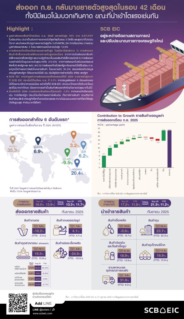 SCB EIC ทบทวนคาดการณ์ GDP หลังส่งออก ก.ย.กลับมาโตสูงสุดรอบ 42 เดือน ทั้งปี 68 อาจบวกเกินคาด