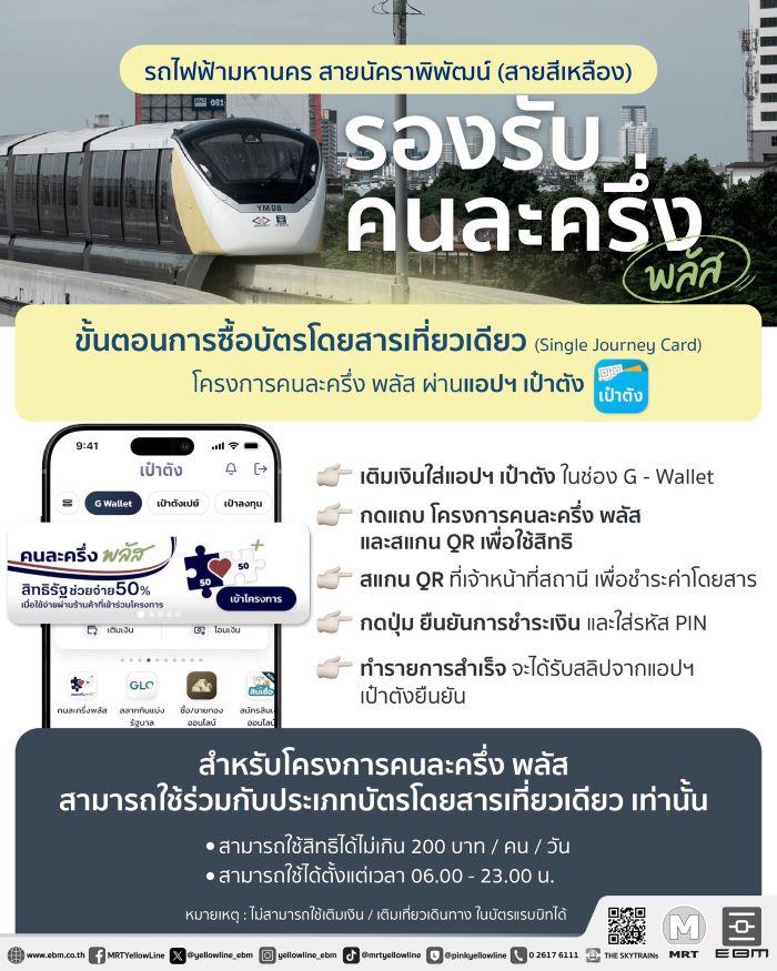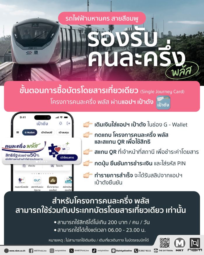 รัฐจัดให้! รถไฟฟ้าทุกสายในเส้นทางกรุงเทพฯ และปริมณฑล เปิดให้ใช้สิทธิ์ “คนละครึ่ง พลัส” ผ่านแอปพลิเคชัน “เป๋าตัง” เพื่อซื้อบัตร/เหรียญโดยสารเที่ยวเดียว ทั้ง BTS สายสีเขียว, สีทอง, MRT สายสีน้ำเงิน, สีม่วง, สีชมพู, สีเหลือง, รถไฟฟ้าชานเมืองสายสีแดง และแอร์พอร์ต เรล ลิงก์ มาหมด! เริ่มใช้ได้ตั้งแต่วันพรุ่งนี้ (29 ต.ค.) ถึง 31 ธ.ค.68