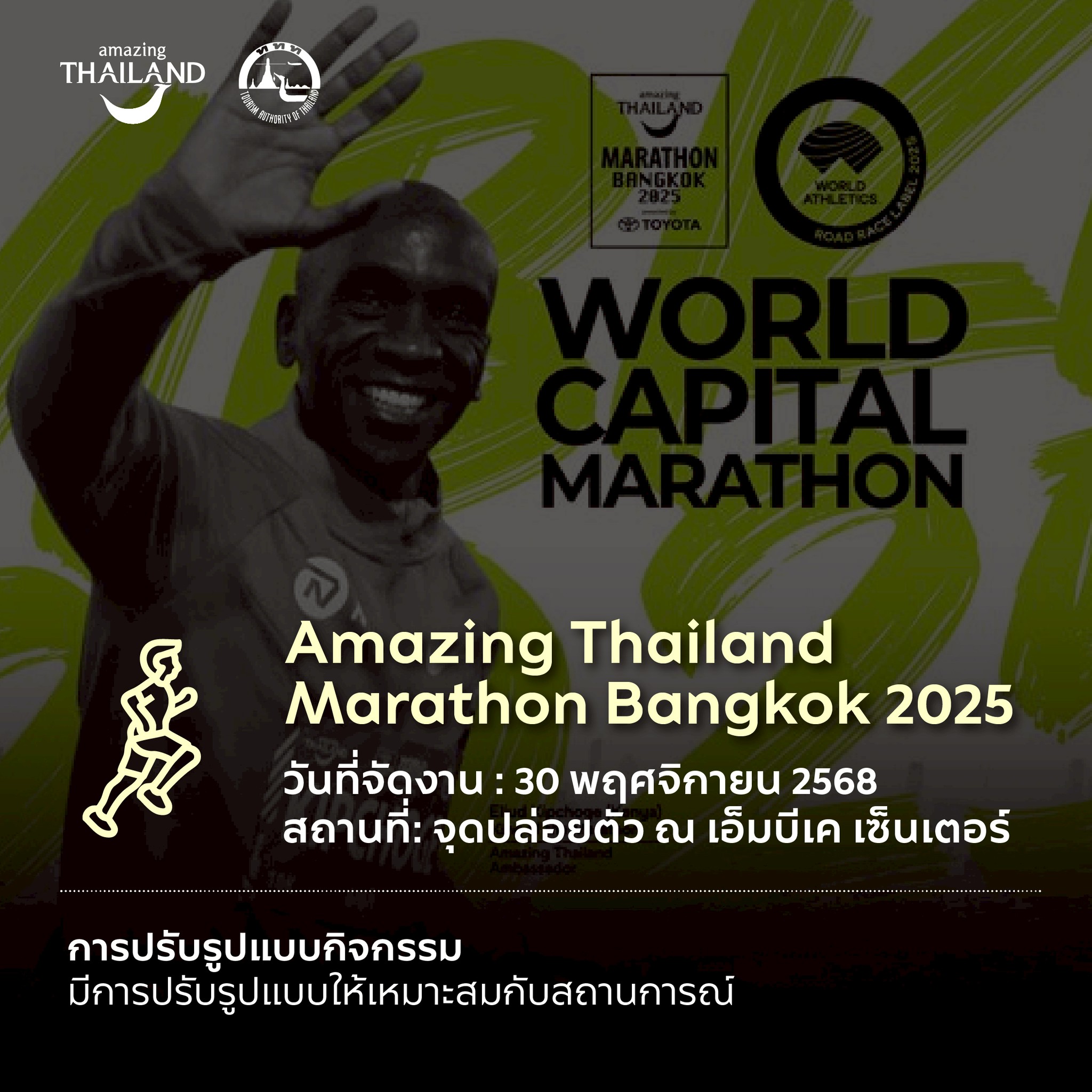 – งาน Amazing Thailand Marathon Bangkok 2025 กำหนดจัดงาน 30 พฤศจิกายน 2568 ณ จุดปล่อยตัว ณ เอ็มบีเค เซ็นเตอร์ และเส้นชัย ณ ท้องสนามหลวง ยังคงจัดงานตามกำหนดการเดิม โดยจะปรับรูปแบบของงานให้มีความเหมาะสมกับสถานการณ์