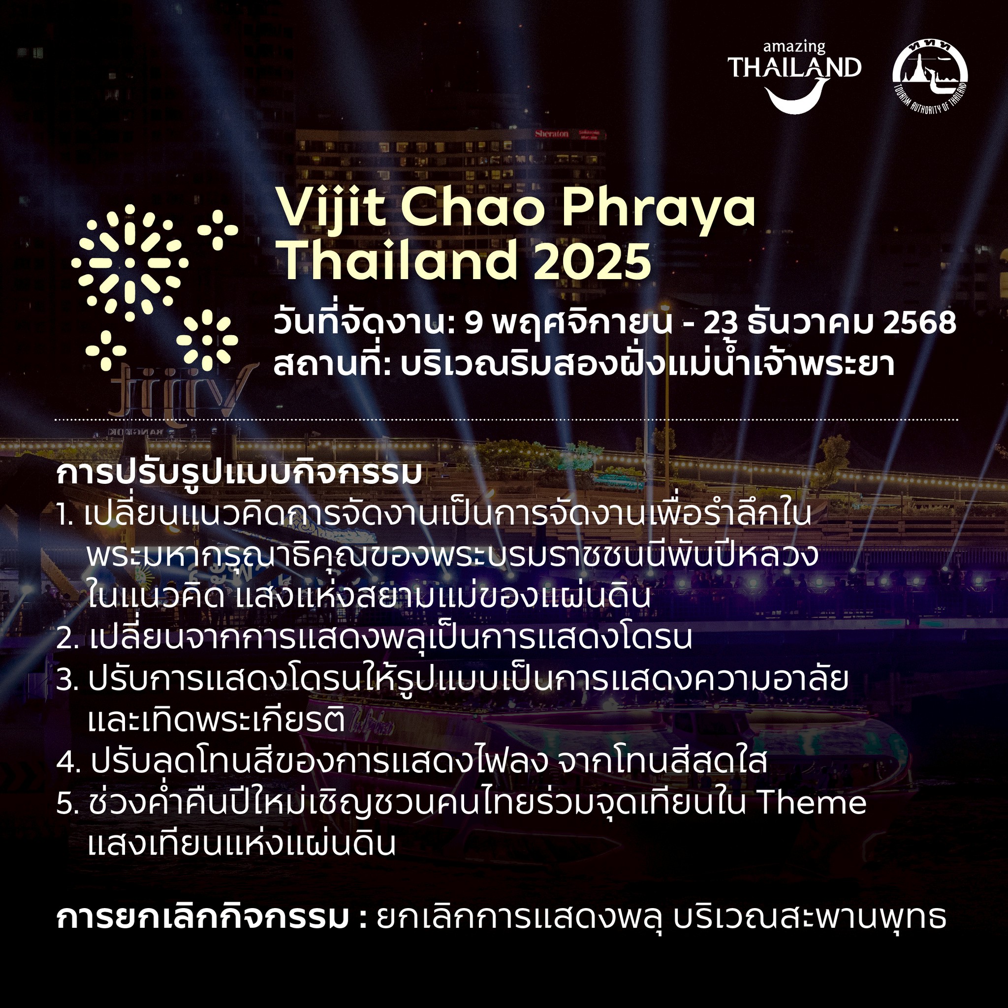– กิจกรรม VIJIT CHAOPRAYA THAILAND 2025 เลื่อนกำหนดการจัดกิจกรรมจากกำหนดเดิมในวันที่ 1 พฤศจิกายน – 15 ธันวาคม 2568 ณ บริเวณริมสองฝั่งแม่น้ำเจ้าพระยา กรุงเทพมหานคร เป็นวันที่ 9 พฤศจิกายน-23 ธันวาคม 2568 โดยปรับรูปแบบการจัดงาน ภายใต้แนวคิดการจัดงานใหม่ เพื่อรำลึกในพระมหากรุณาธิคุณของพระบรมราชชนนีพันปีหลวง ด้วยแนวคิด “แสงแห่งสยามแม่ของแผ่นดิน” และเปลี่ยนการแสดงจากพลุเป็นการแสดงโดรน แสดงความอาลัยและเทิดพระเกียรติ รวมทั้งปรับลดโทนแสงและสีของการแสดงไฟให้เหมาะสมยิ่งขึ้น โดยในช่วงค่ำคืนปีใหม่ขอเชิญชวนประชาชนร่วมกิจกรรม “แสงเทียนแห่งแผ่นดิน” จุดเทียนรวมใจถวายเป็นพระราชกุศล
