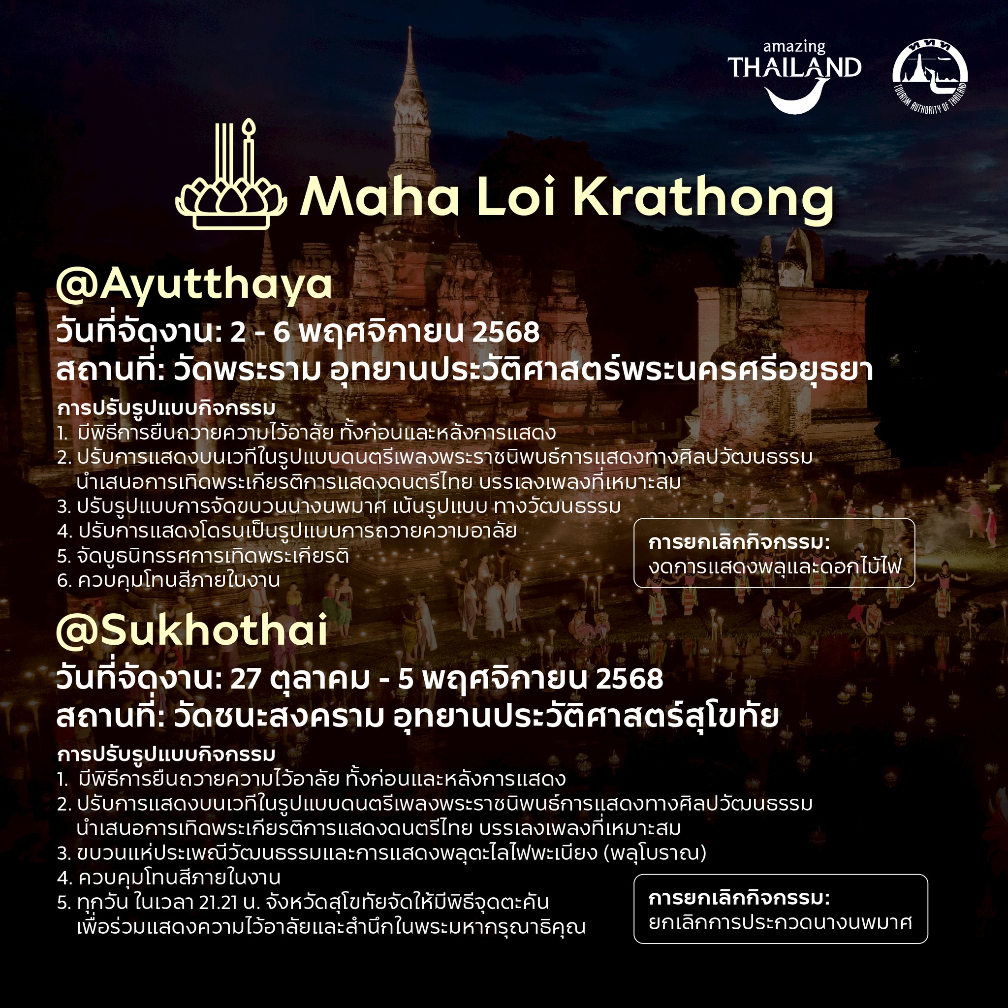 – งาน Maha Loy Krathong @ Ayutthaya กำหนดจัดงาน 2-6 พฤศจิกายน 2568 ณ วัดพระราม อุทยานประวัติศาสตร์พระนครศรีอยุธยา จังหวัดพระนครศรีอยุธยา ยังคงจัดงานตามกำหนดเดิม ทั้งนี้ ได้มีการปรับรูปแบบการจัดงานให้มี Mood & Tone ให้เหมาะสมกับช่วงสถานการณ์ไว้อาลัย โดยงดการแสดงพลุและดอกไม้ไฟ พร้อมจัดให้มีพิธีถวายความอาลัย