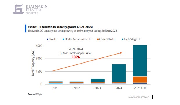 บล.เกียรตินาคินภัทร (KKPS) เปิดเผยผลการพูดคุยกับบริษัทวิจัยโครงสร้างพื้นฐานดิจิทัลระดับโลก DCByte ว่า ประเทศไทยกำลังก้าวขึ้นเป็นหนึ่งในศูนย์กลางดาต้าเซนเตอร์สำคัญของเอเชียตะวันออกเฉียงใต้ จากกระแสการย้ายฐานการลงทุนของผู้ให้บริการขนาดใหญ่ (Hyperscaler) จากสิงคโปร์และยะโฮร์ ประเทศมาเลเซีย เข้ามาลงทุนในไทยเพิ่มขึ้นอย่างมีนัยสำคัญ