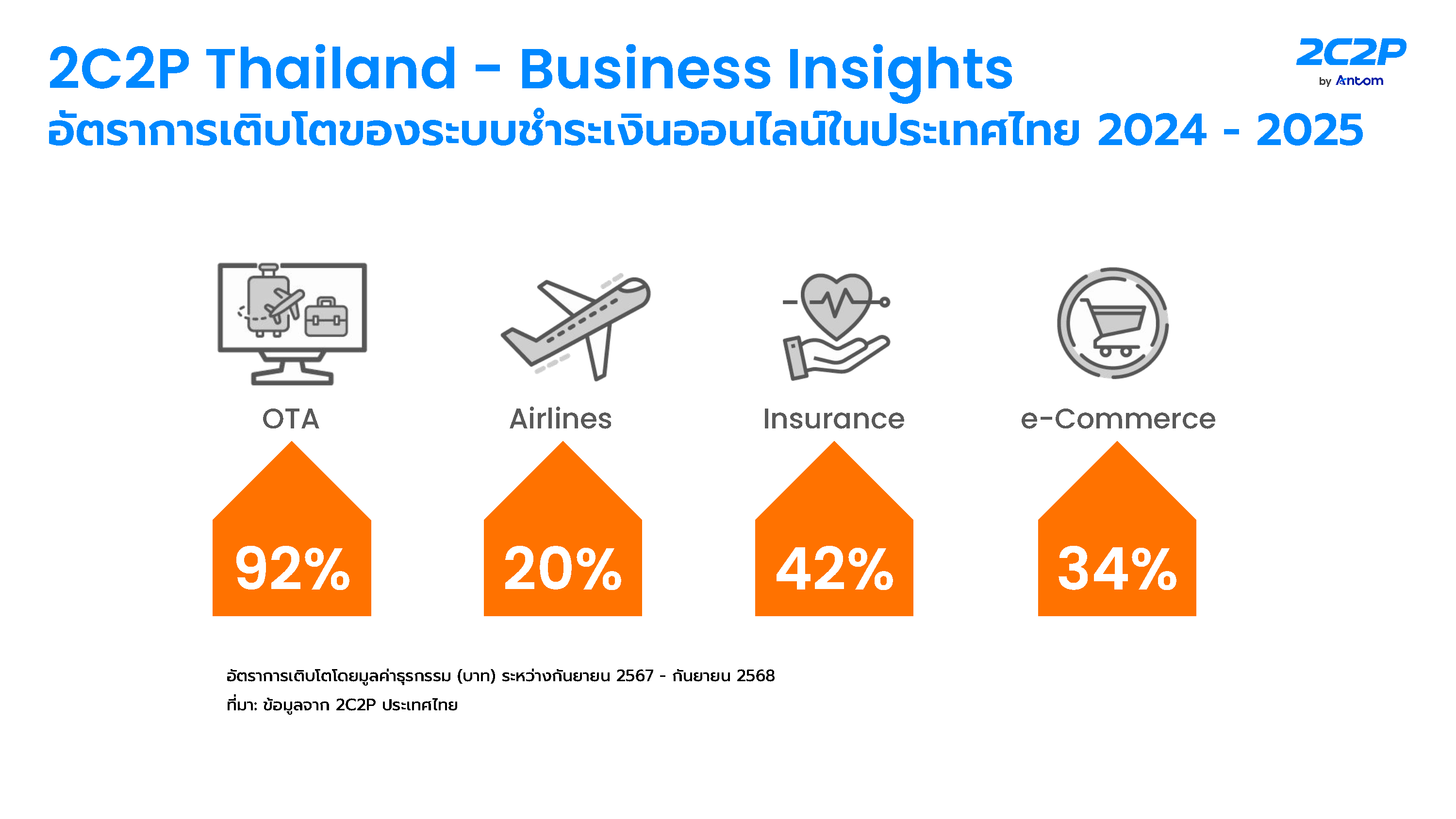 นายวรฉัตร กล่าวเพิ่มเติมถึงการสำรวจตลาด ข้อมูลเชิงลึกจาก 2C2P ชี้ว่า ธุรกิจ Online Travel Agency (OTA) มีอัตราการเติบโตสูงสุดถึง 92% รองลงมาคือ ประกันภัย (42%) อีคอมเมิร์ซ (34%) และ สายการบิน (20%) สะท้อนความต้องการระบบชำระเงินที่มั่นคงและยืดหยุ่นในยุคดิจิทัล