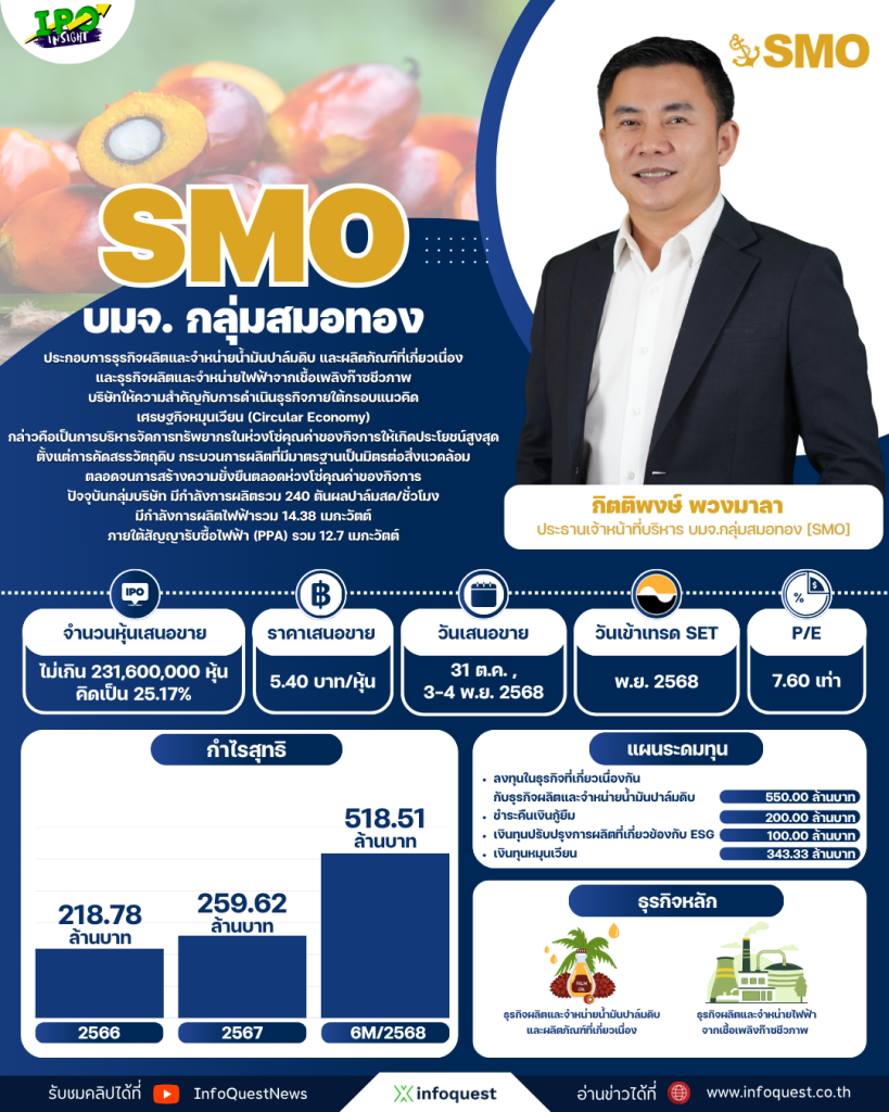 ๐ เปิดใจผู้บริหาร SMO :: นายกิตติพงษ์ พวงมาลา ประธานเจ้าหน้าที่บริหารเปิดเผยกับ “อินโฟเควสท์” ว่า บริษัทมีแผนจะนำเงินระดมทุนครั้งนี้ไปขยายกำลังการผลิตโดยสร้างโรงงานแห่งใหม่ในภาคใต้ ซึ่งเป็นทำเลที่มีปาล์มหนาแน่น คาดว่าจะสร้างแล้วเสร็จในปลายปี 70 หรือ ต้นปี 71