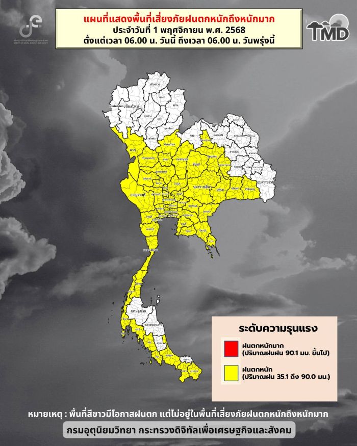 กรมอุตุนิยมวิทยา ออกประกาศ เรื่อง “อากาศแปรปรวนบริเวณประเทศไทย” ฉบับที่ 10 (317/2568) โดยระบุว่า ในช่วงวันที่ 1-2 พ.ย. 68 ประเทศไทยตอนบน และภาคใต้ตอนบนมีสภาพอากาศเปลี่ยนแปลง โดยเฉพาะจังหวัดนครสวรรค์ อุทัยธานี ชัยนาท สุพรรณบุรี ลพบุรี สระบุรี เพชรบุรี ประจวบคีรีขันธ์ ชุมพร ระนอง พังงา และภูเก็ต