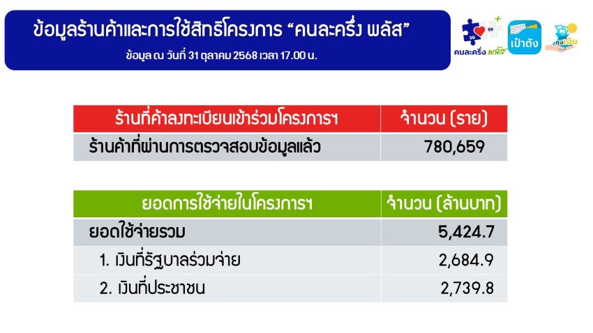 นายวินิจ วิเศษสุวรรณภูมิ ผู้อำนวยการสำนักงานเศรษฐกิจการคลัง (สศค.) ในฐานะโฆษกกระทรวงการคลัง เปิดเผยความคืบหน้าการใช้สิทธิโครงการคนละครึ่ง พลัส โดยระบุว่า ณ วันที่ 31 ต.ค.68 เวลา 17.00 น. มีผู้ใช้จ่ายผ่านโครงการฯ สำเร็จแล้วกว่า 13.6 ล้านราย ยอดใช้จ่ายรวมกว่า 5,424.68 ล้านบาท โดยแบ่งเป็นเงินที่ประชาชนจ่ายจำนวน 2,739.81 ล้านบาท และเงินที่รัฐร่วมจ่ายจำนวน 2,684.87 ล้านบาท